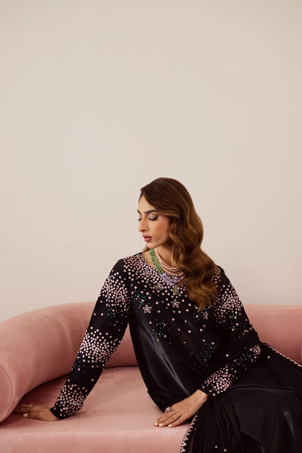 A luxurious black silk long shirt, beautifully adorned with intricate embroidery and delicate hand embellishments, paired with sleek cigarette pants and embroidered chiffon dupatta