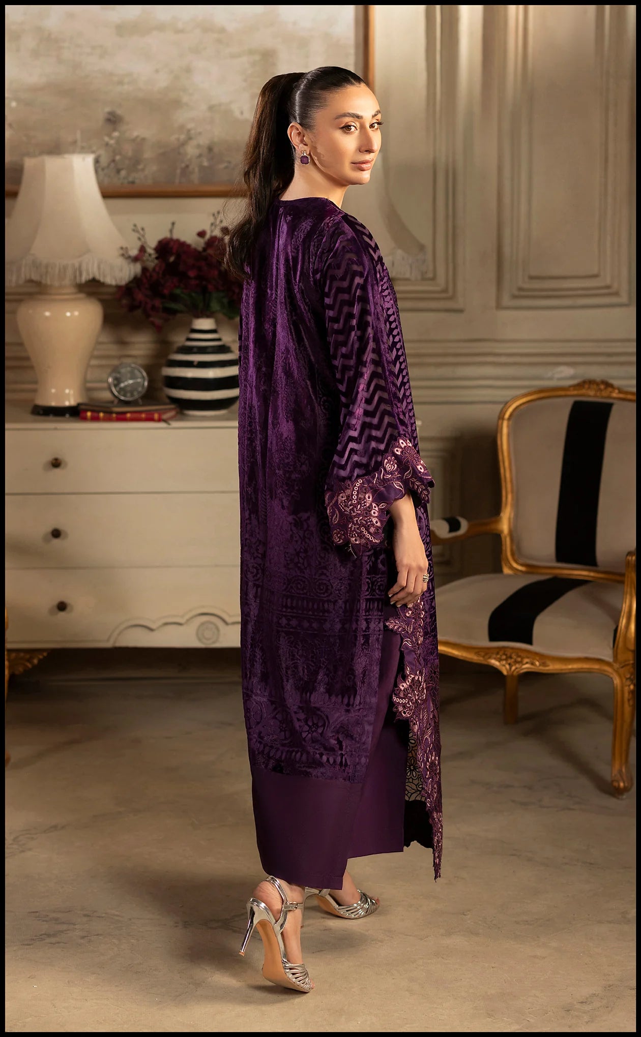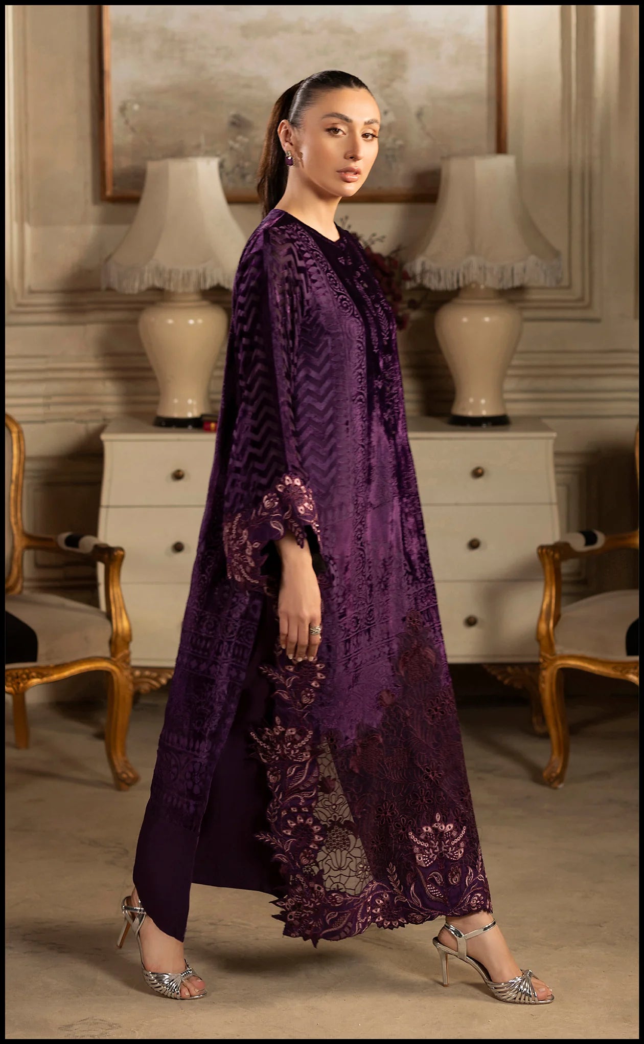 A captivating deep purple velvet shirt, designed for majestic presence. This long-cut ensemble is characterized by its tonal jacquard velvet texture and features an ornate panel of intricate floral embroidery and cutwork lace along the lower half and hem. The rounded neckline and button-front placket enhance its regal silhouette. Paired with tonal viscose trousers.