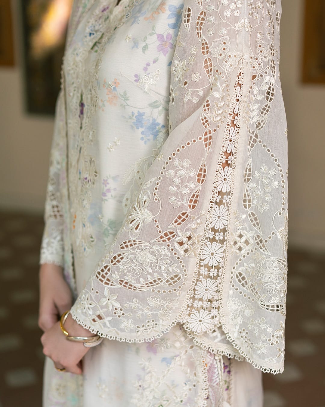 • Step into summer season with this enchanting white ensemble! The double-layered paper lawn shirt showcases a rounded hem and exquisite white-on-white embroidery, while a cutworky lilac border gracefully traces climbing vines. Paired with pleated trousers adorned with leafy appliqué on the hem and a breezy Cotton net dupatta featuring an embroidered border, this outfit is designed for twirling through all the festive fun!