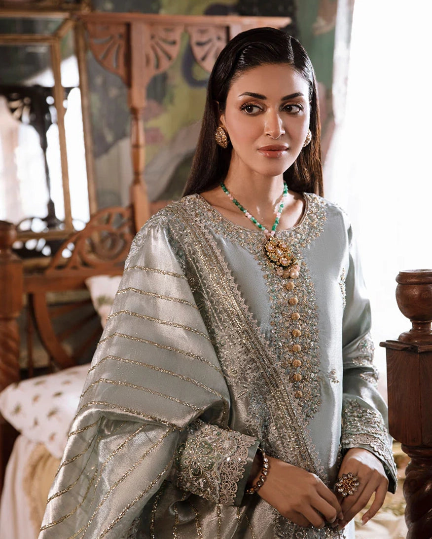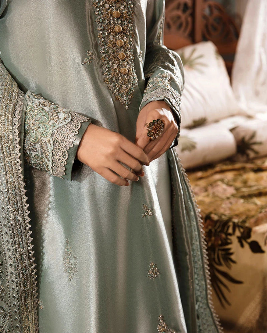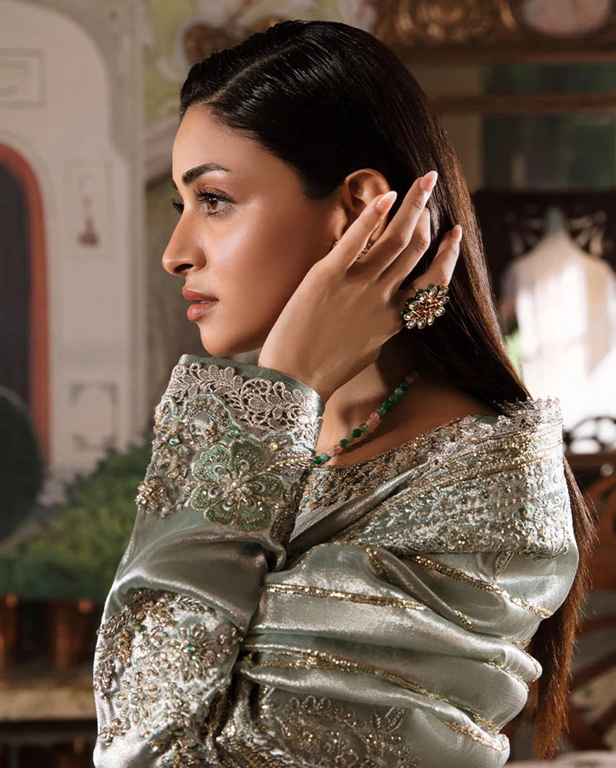 Indulge in ethereal elegance with our sea green silk ensemble, adorned with exquisite hand embellished details. Delicate motifs and intricate patterns, meticulously crafted with fine artistry, grace the fabric, radiating a subtle yet captivating charm, perfect for making a sophisticated statement.