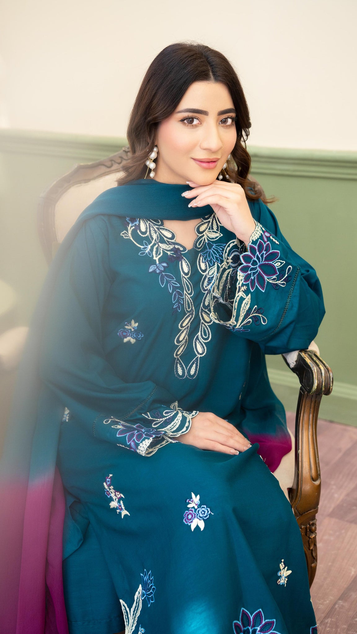 Make a graceful winter statement with our teal embroidered suit. Crafted from soft, cozy fabric, this outfit features delicate floral embroidery with cutwork detailing on the sleeves and hem for a beautifully refined finish. Paired with matching trousers and a two-toned dupatta, Perfect for winter dinners, get-togethers, or everyday wear.