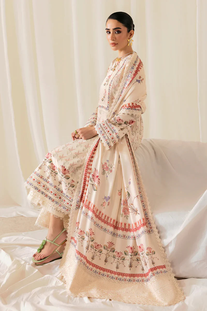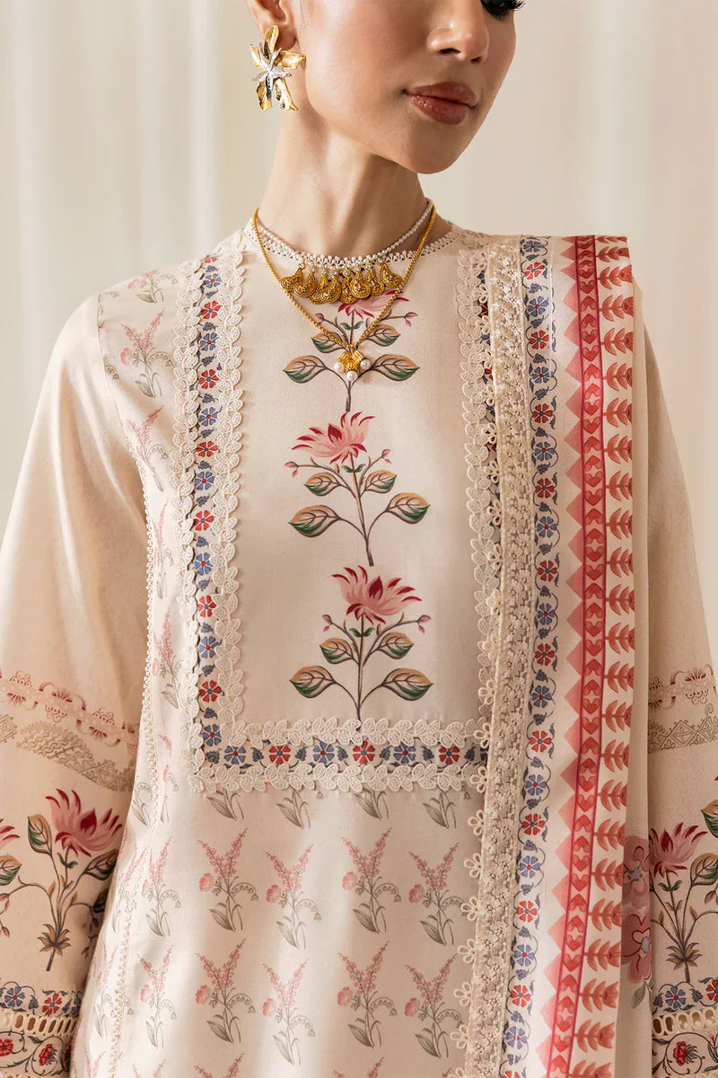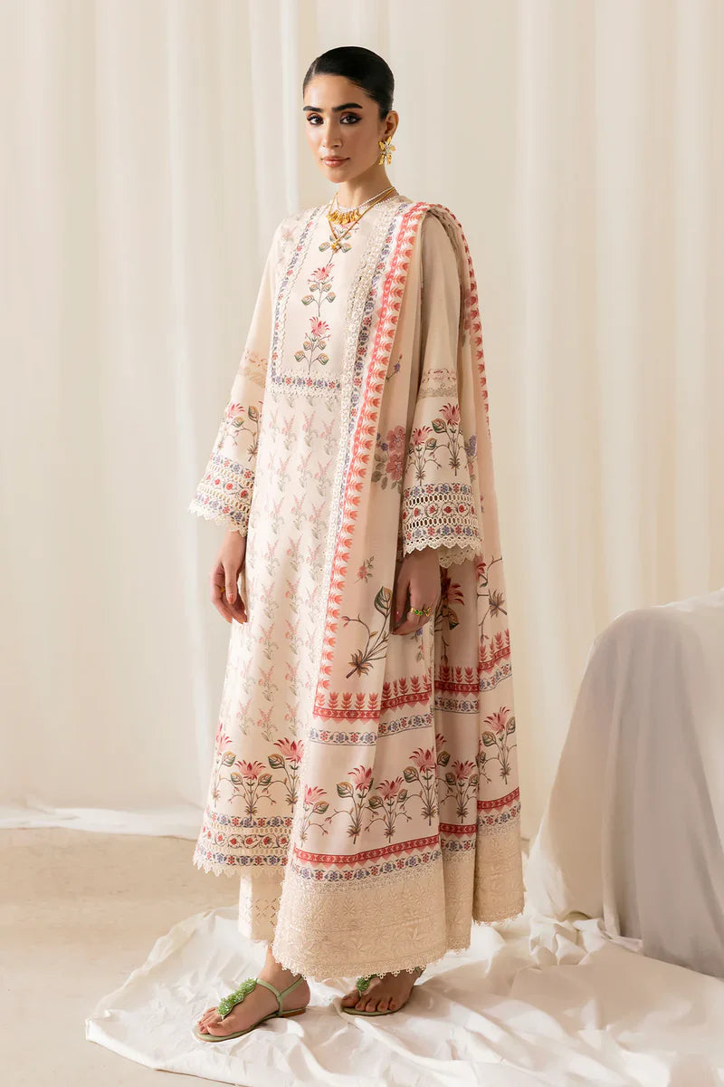 An elegant off-white printed kurta adorned with delicate floral and geometric motifs in soft pastel tones. The design features intricate borders along the sleeves and hemline, enhanced with lace detailing and mirror-like accents for added charm. Paired with a matching printed dupatta.