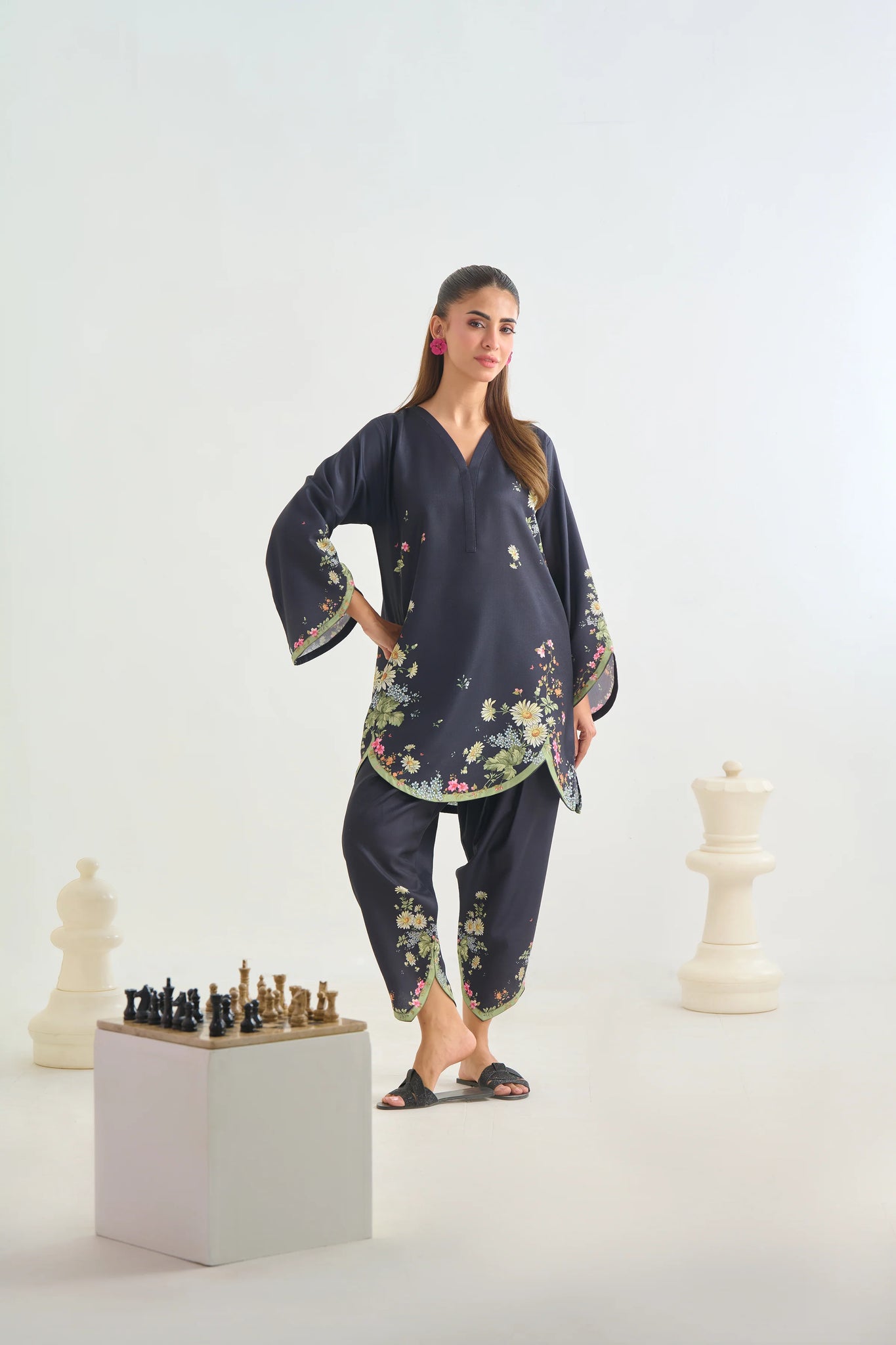 mauve printed cord set, featuring a delicate and whimsical Victorian-inspired floral print. The set is crafted for comfort with soft, textured cord fabric and thoughtful detailing, including a round hemline that adds a subtle, feminine touch.