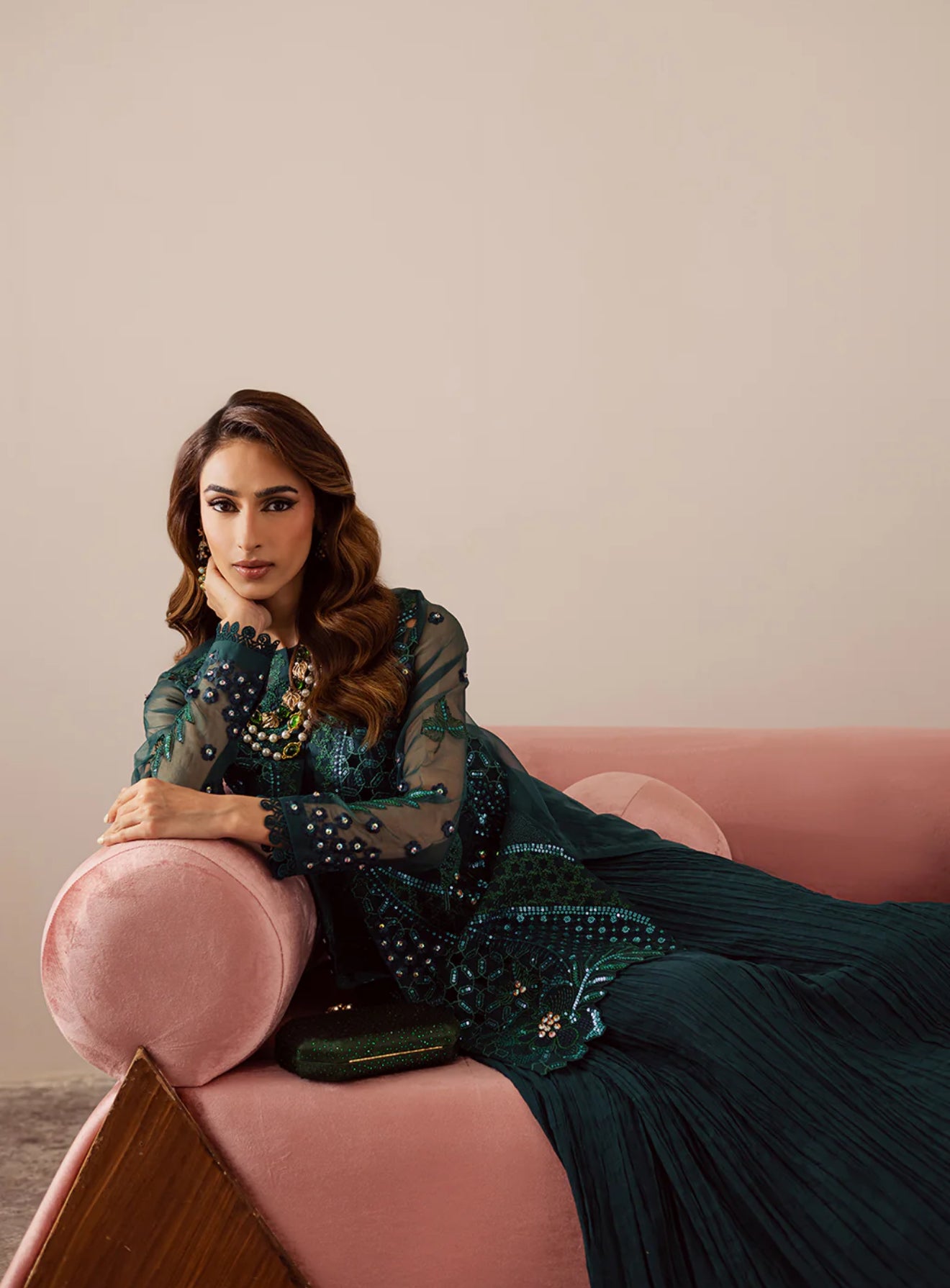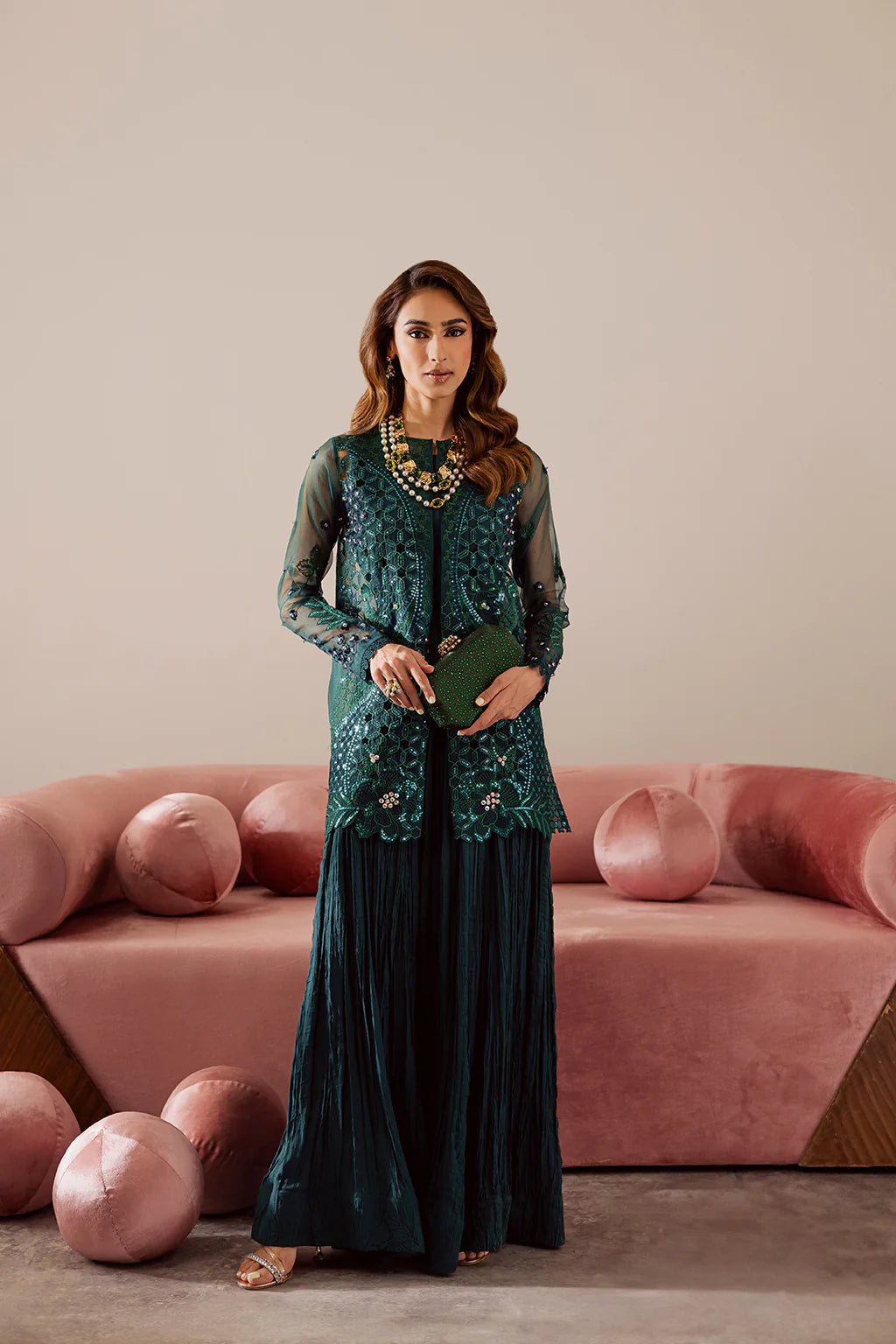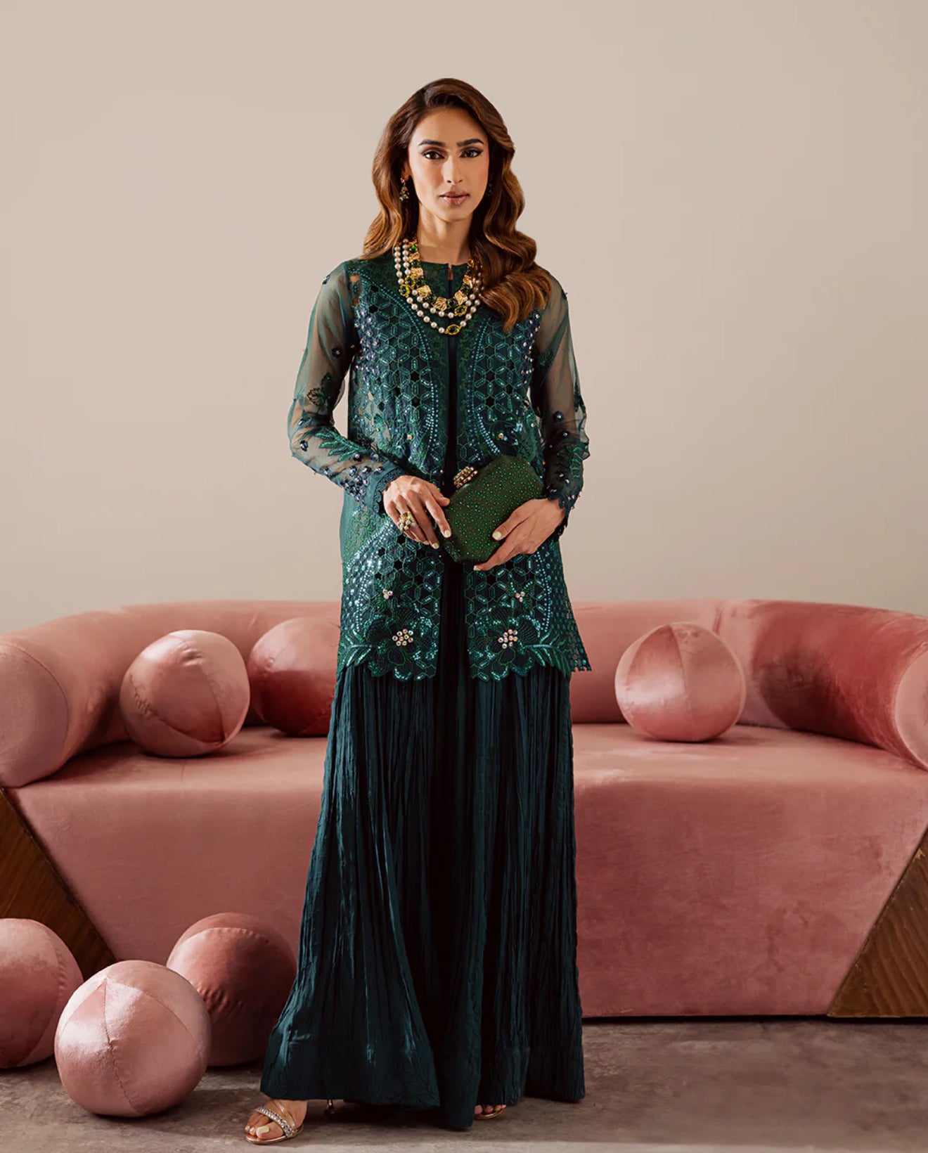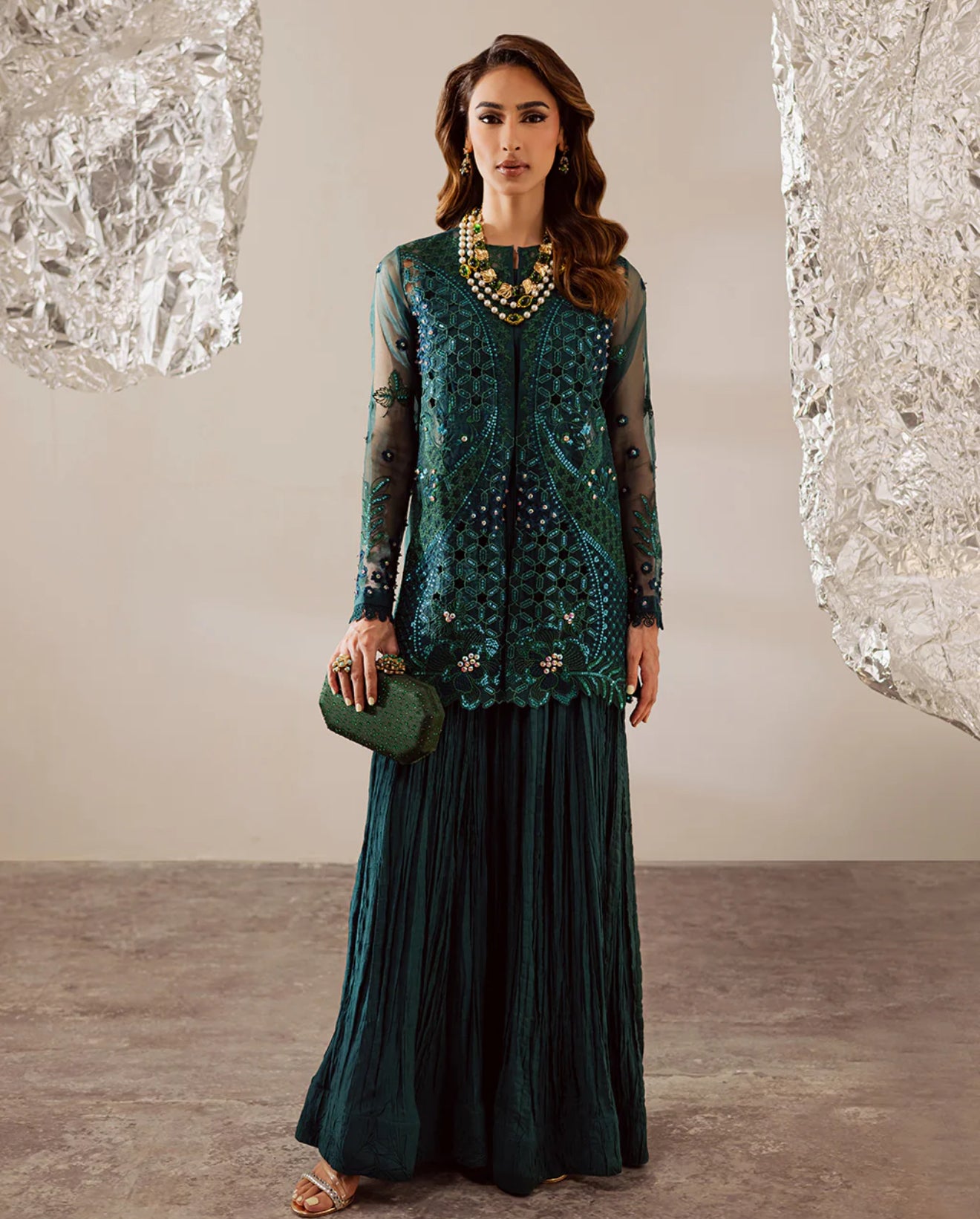 An ethereal organza jacket, beautifully embroidered and delicately hand-embellished, paired with a crushed raw silk long dress. Designed with a graceful double-layer silhouette