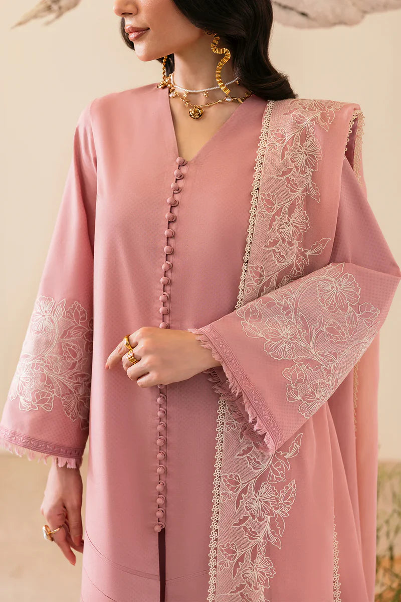 A dusty pink front-open shirt with delicate buttons, intricate white embroidery on the sleeves and chiffon dupatta, finished with lace and cutwork detailing for an effortlessly elegant look.