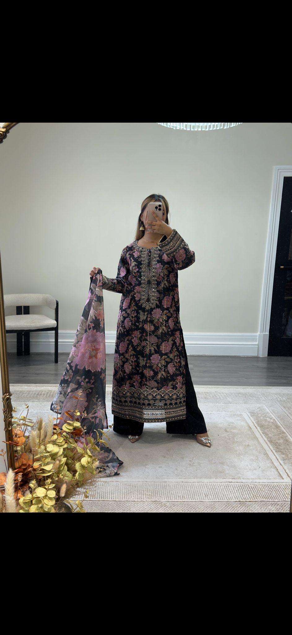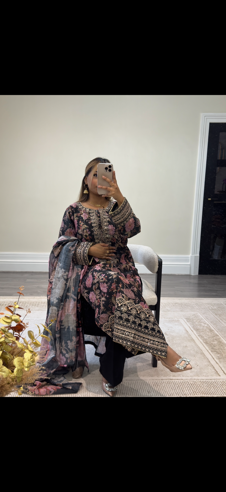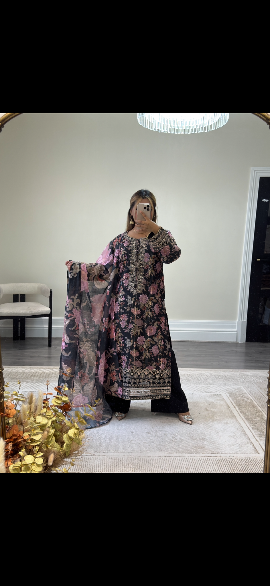 New floral print suit with embellishment detailing and wide leg trouser and organza duppata.