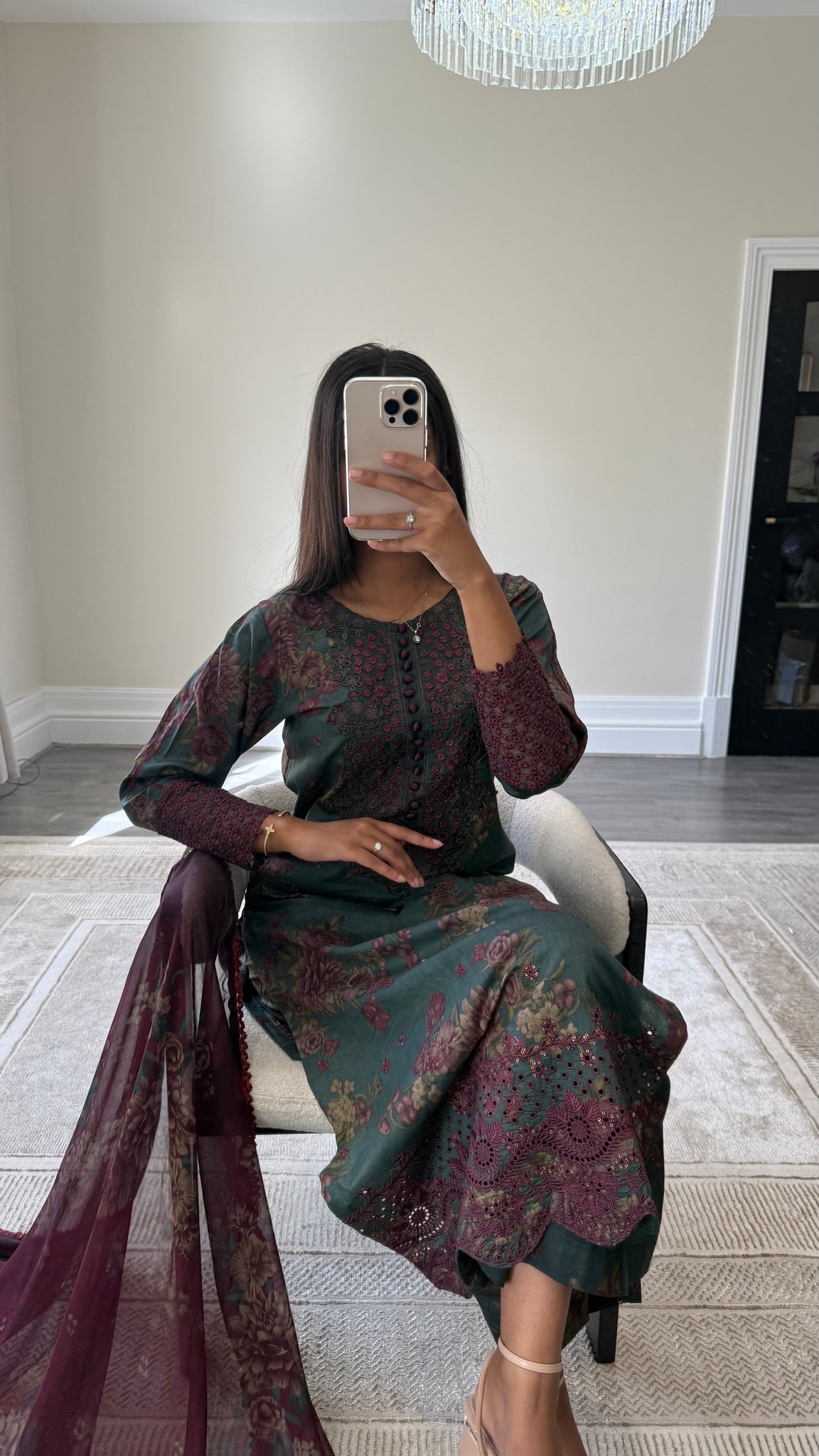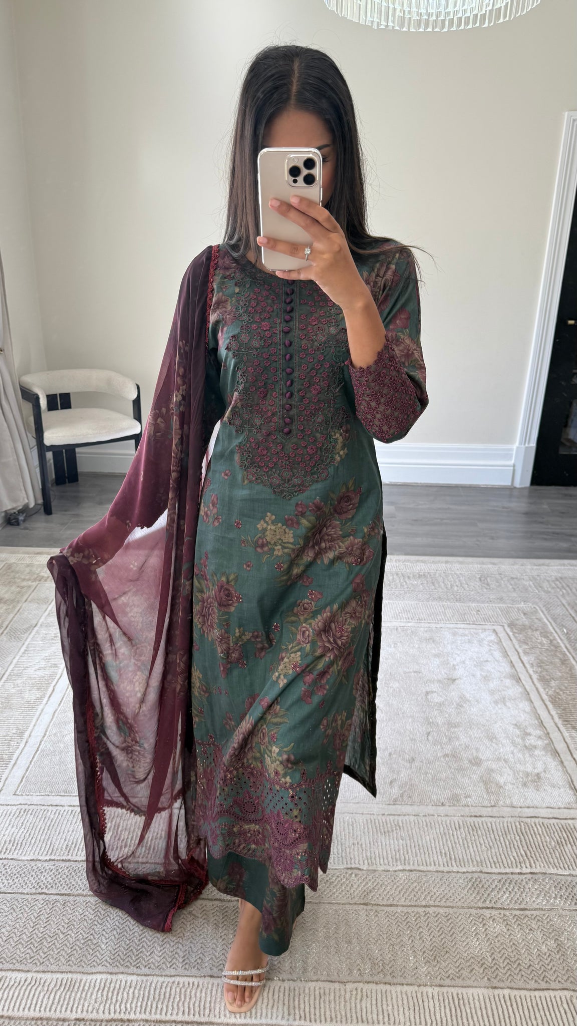 Printed lawn suit with embroidery derailing with chiffon duppata and lawn trouser.