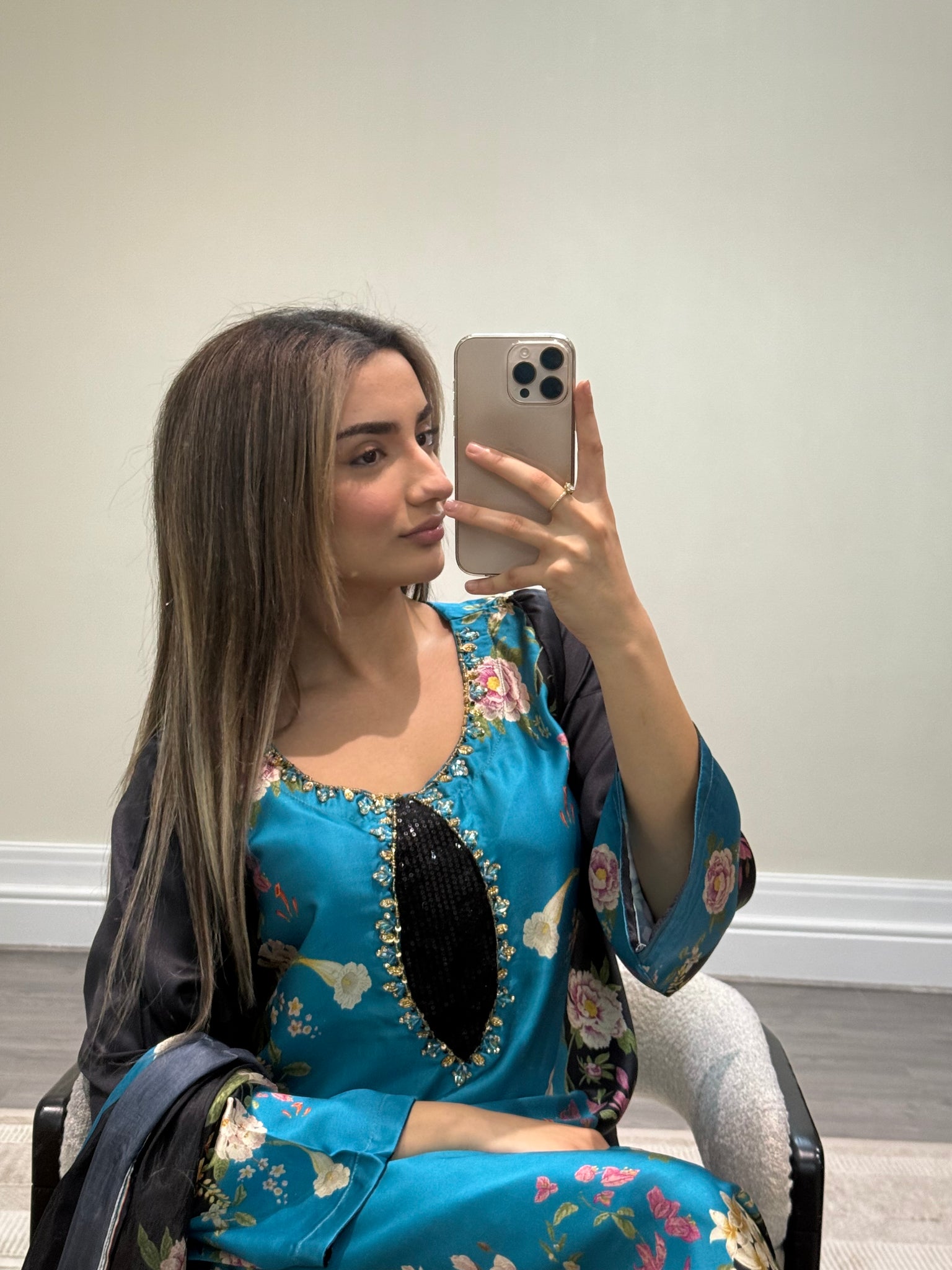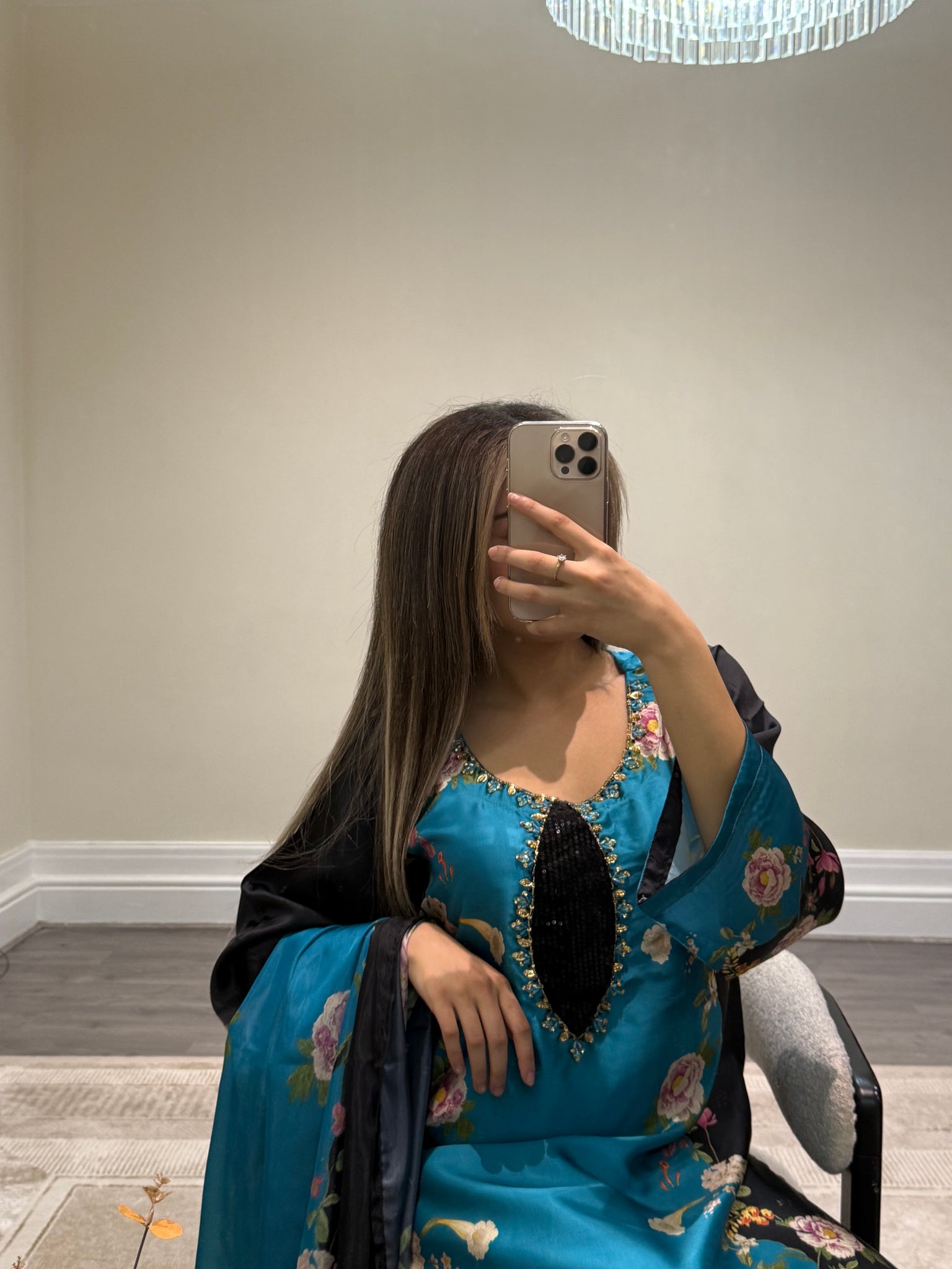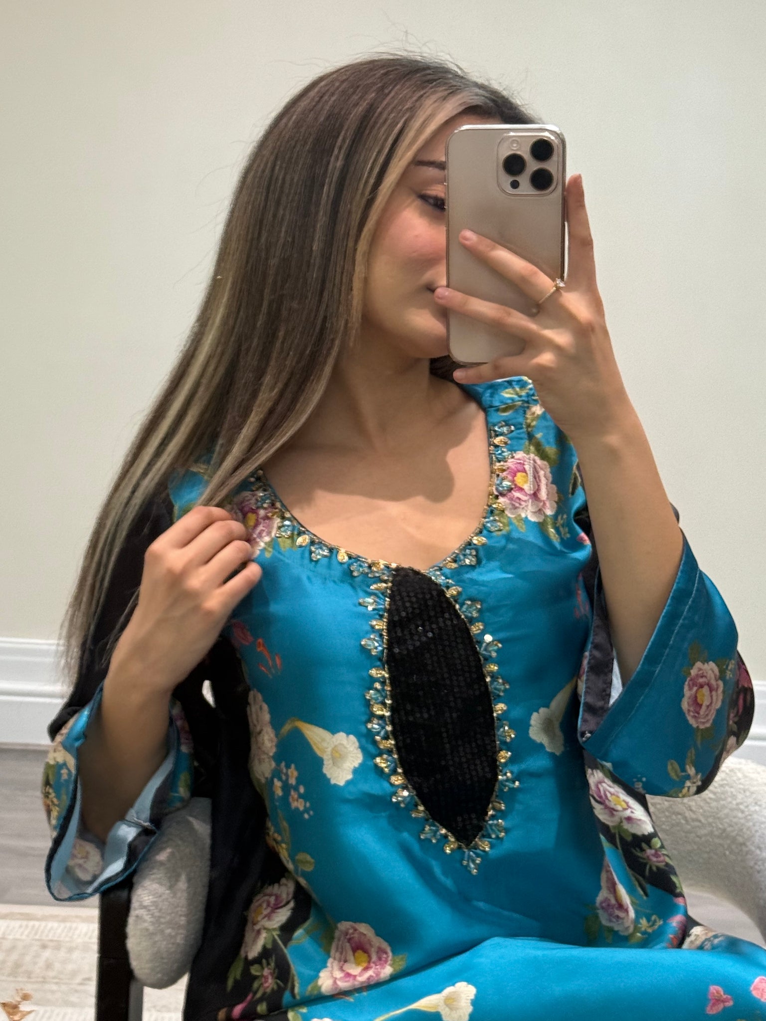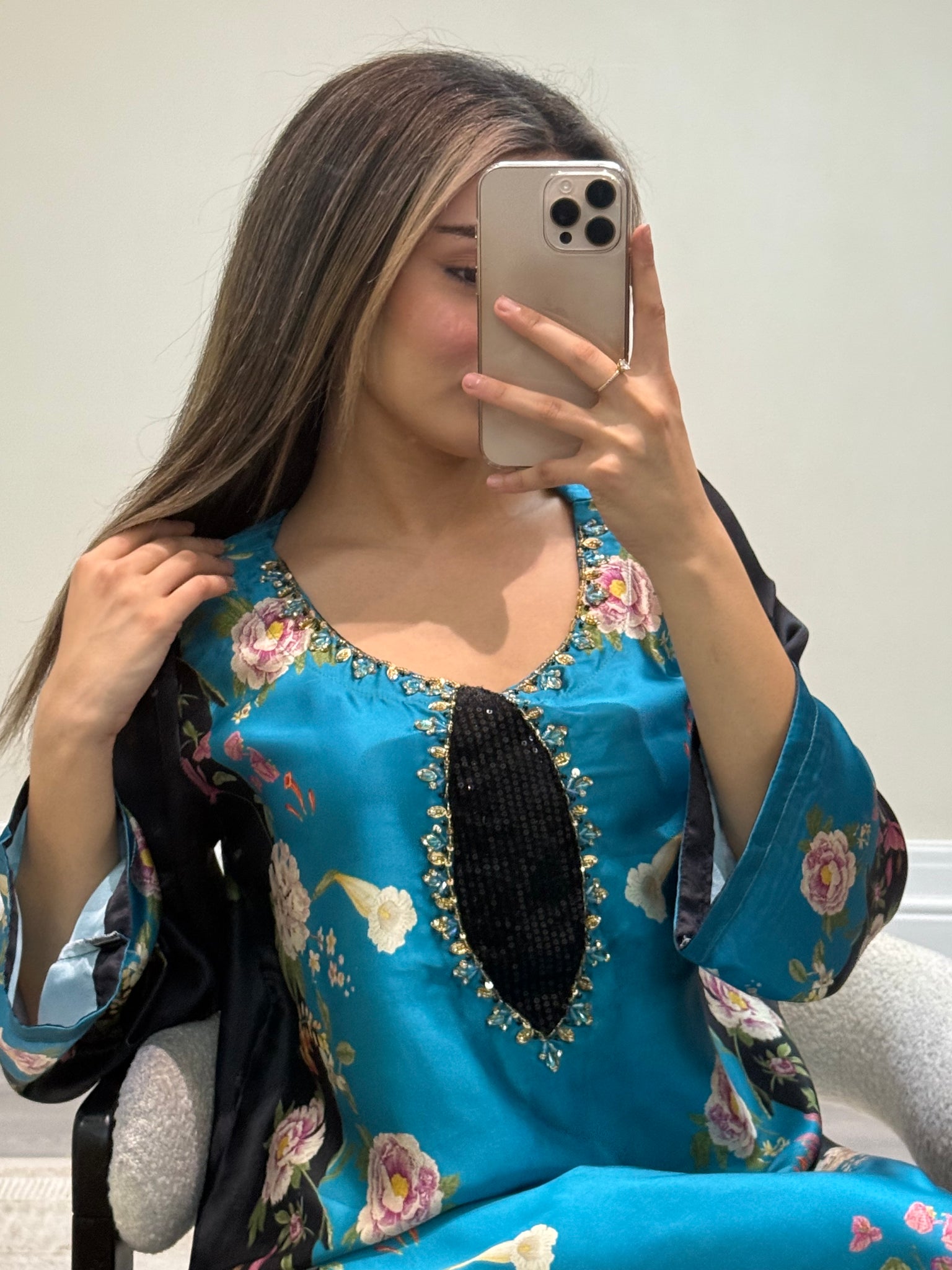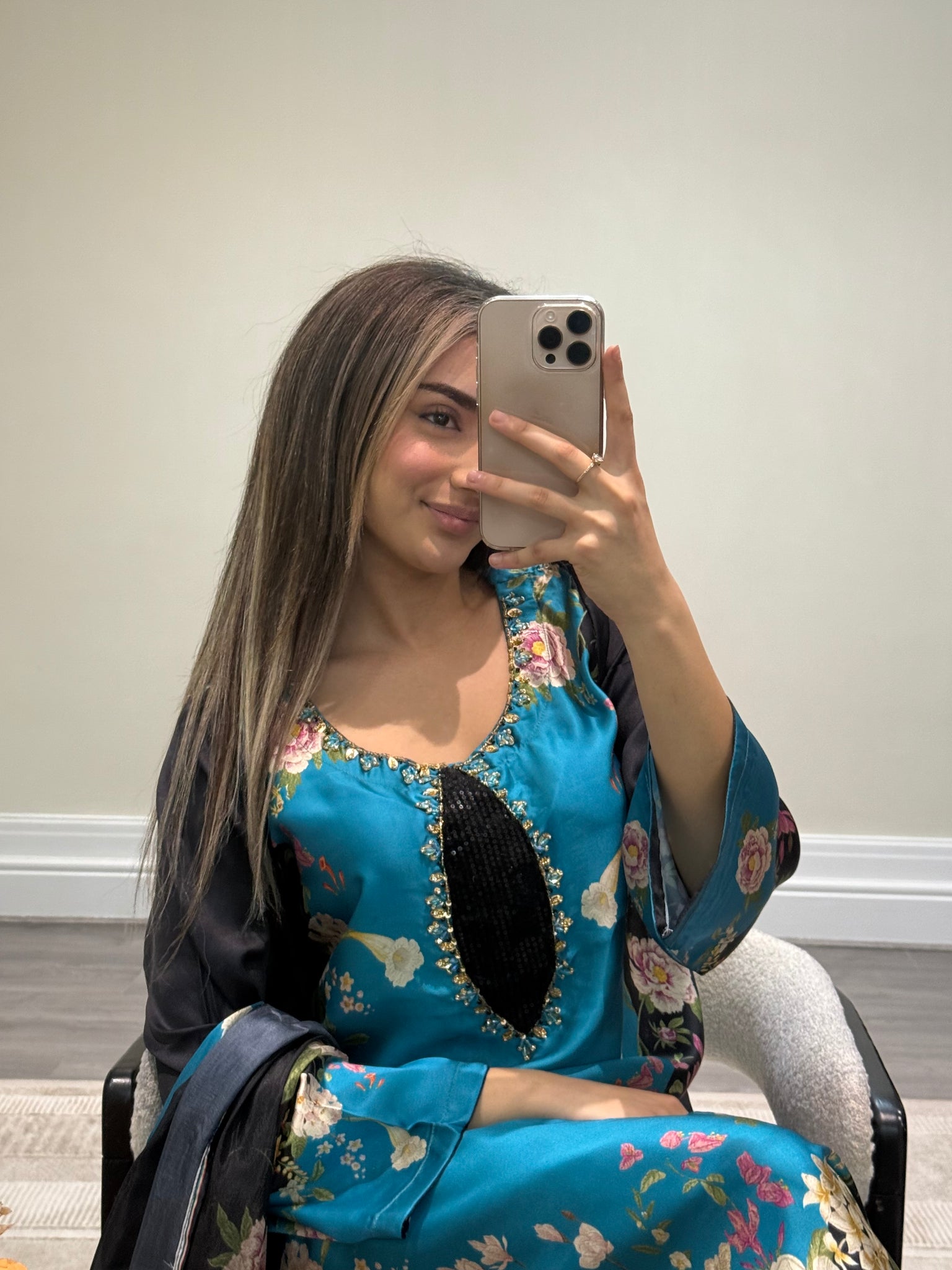 Silk 3 piece suit with handwork embroidery on neckline. Capri trouser and silk duppata