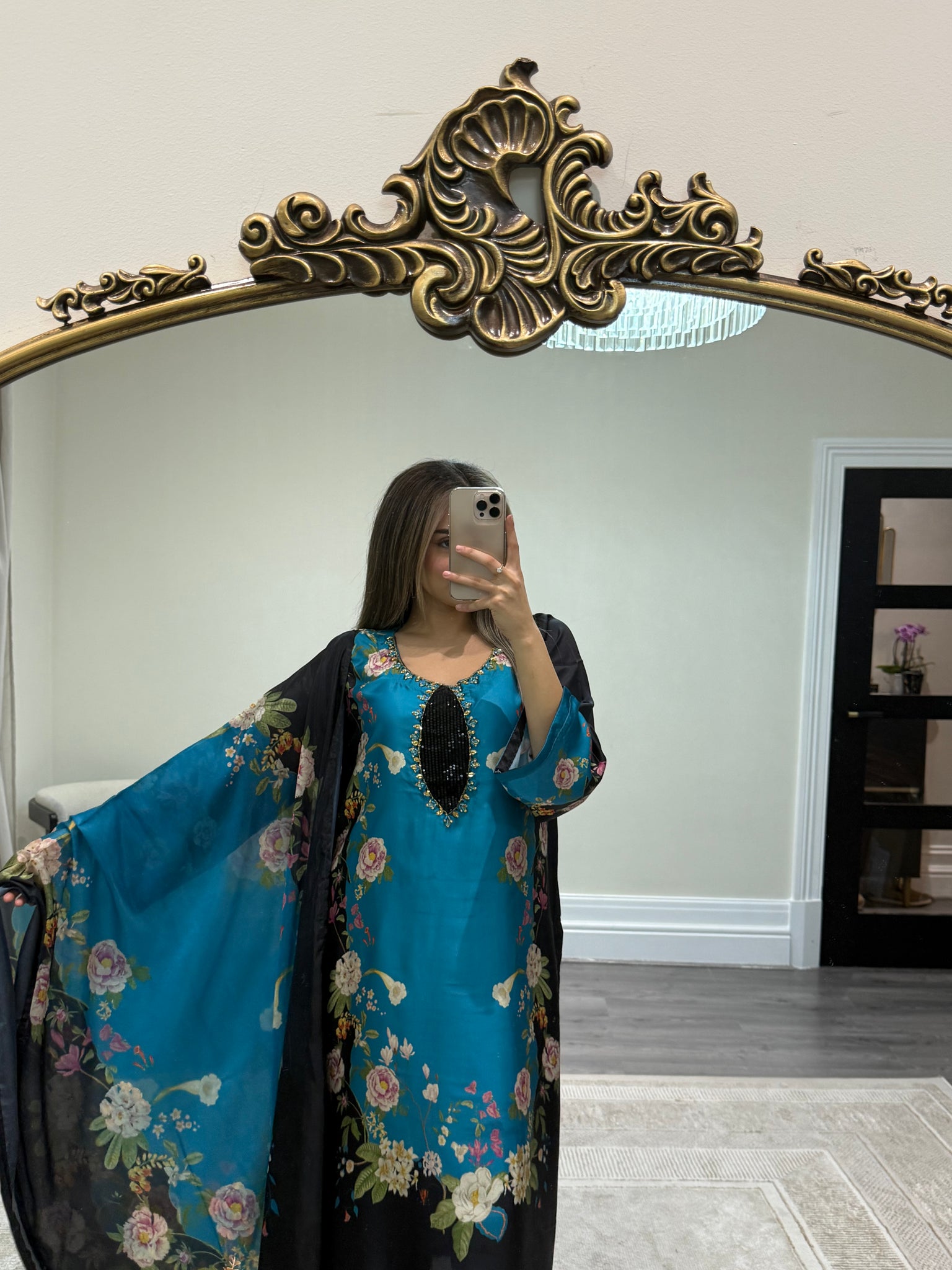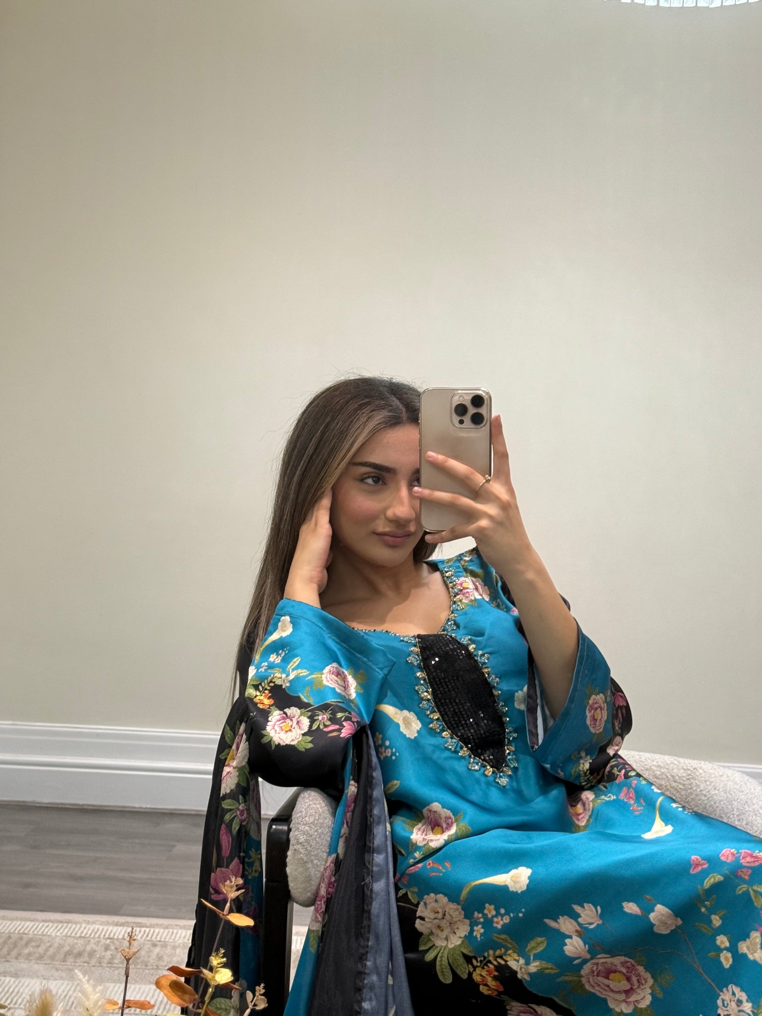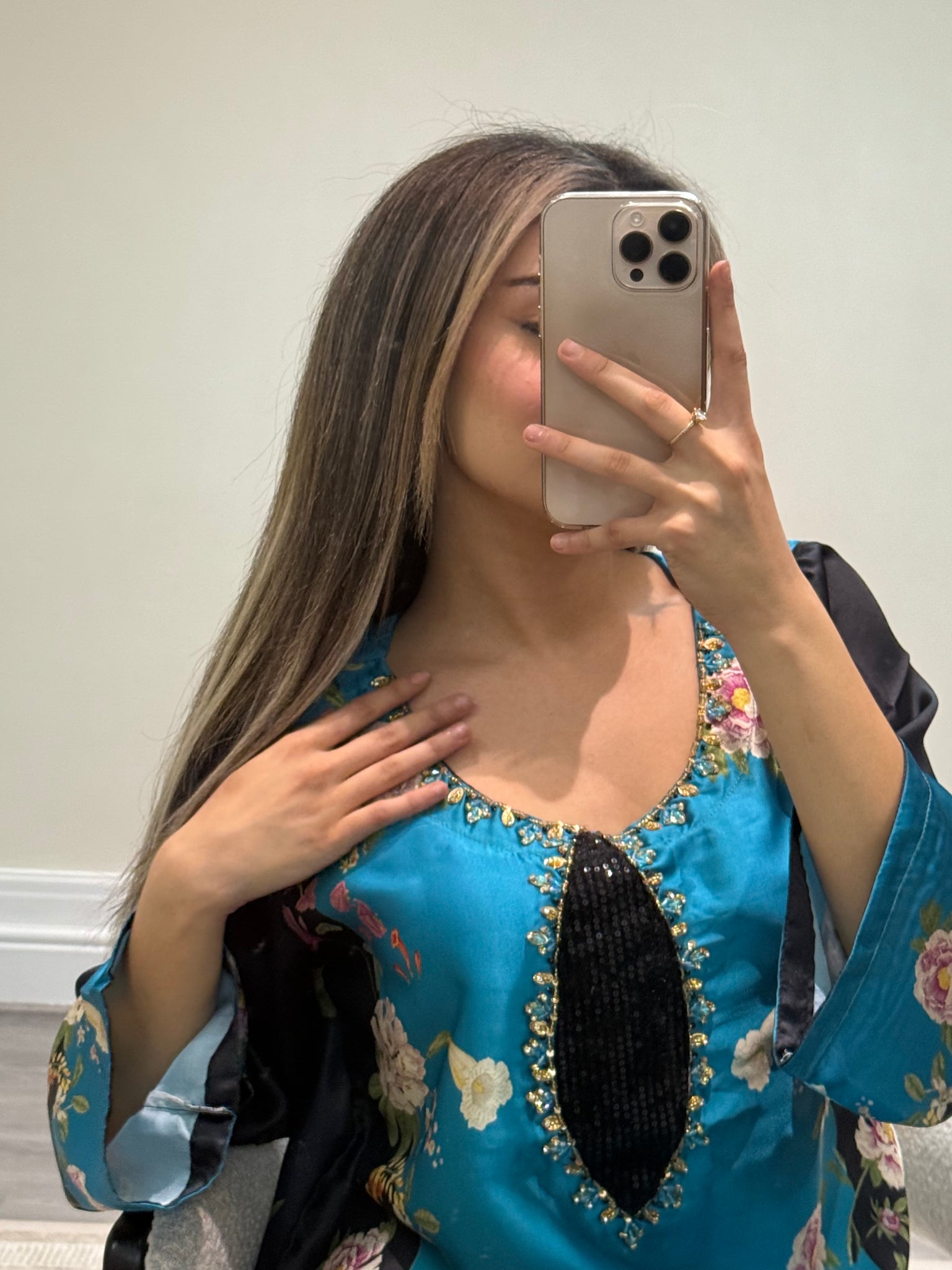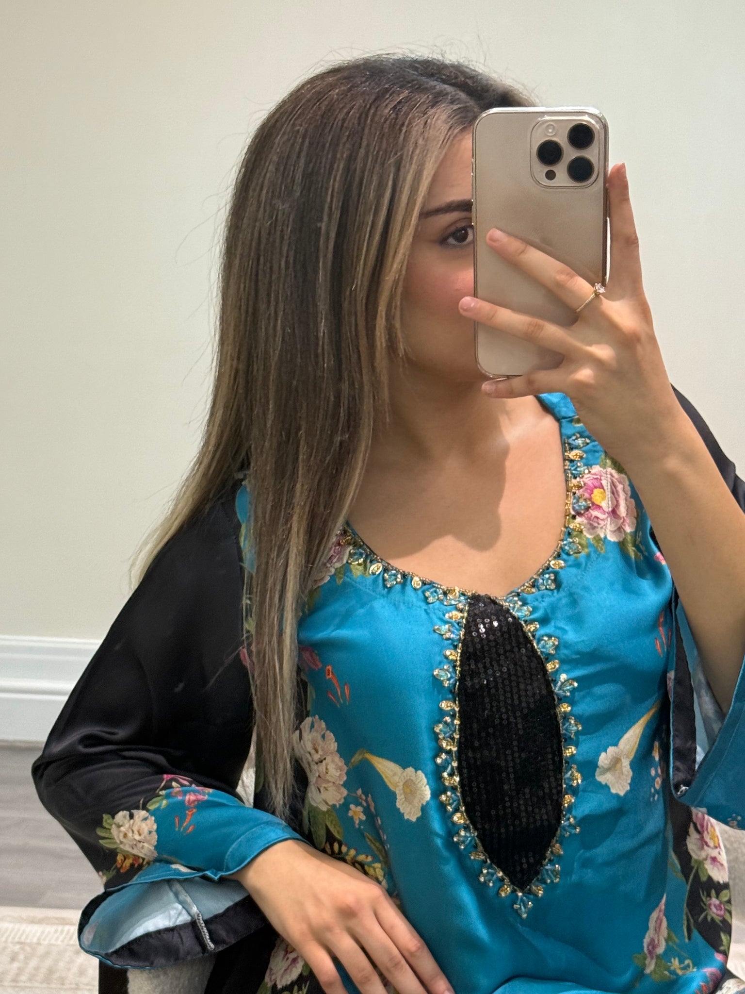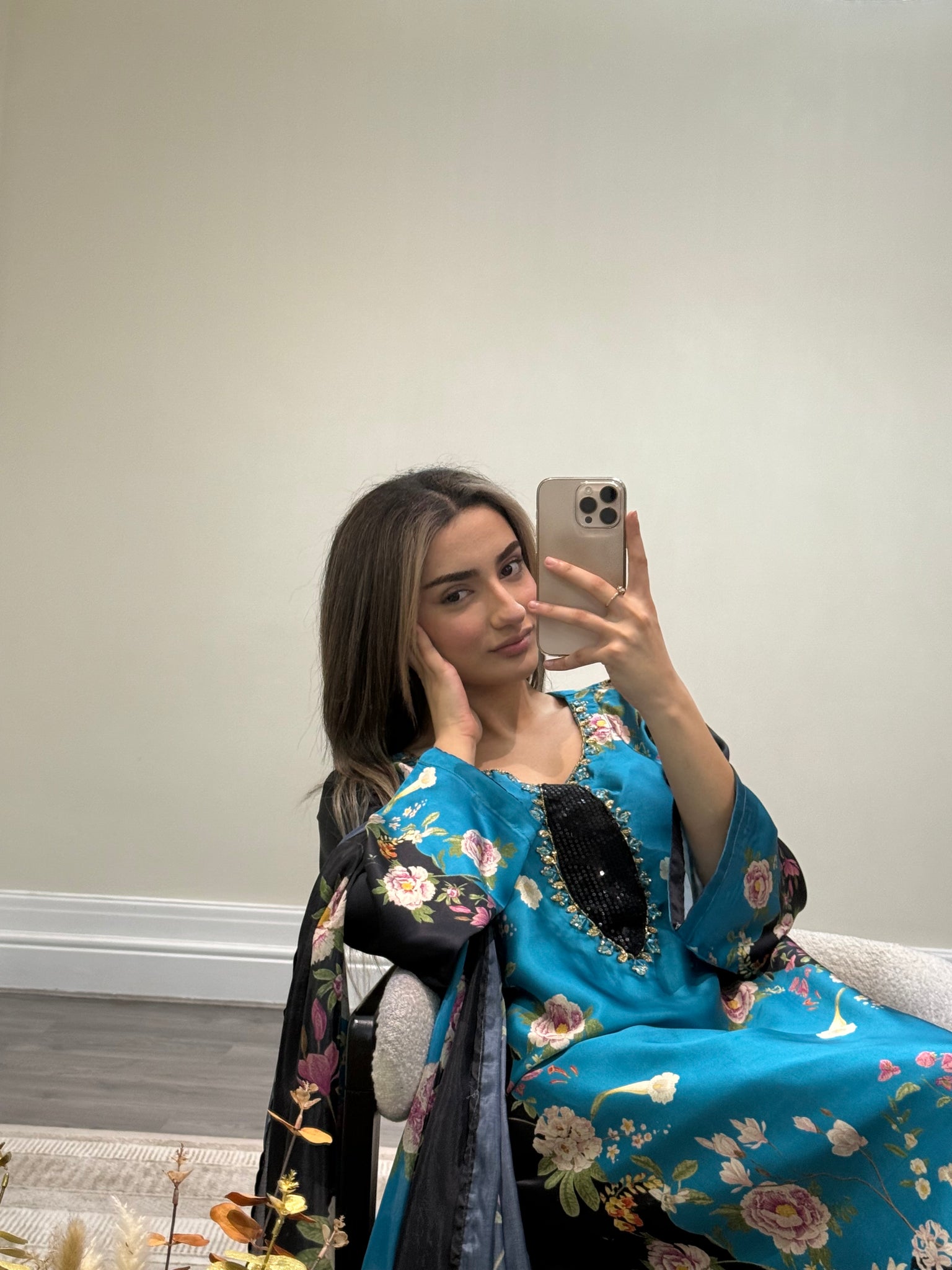 Silk 3 piece suit with handwork embroidery on neckline. Capri trouser and silk duppata