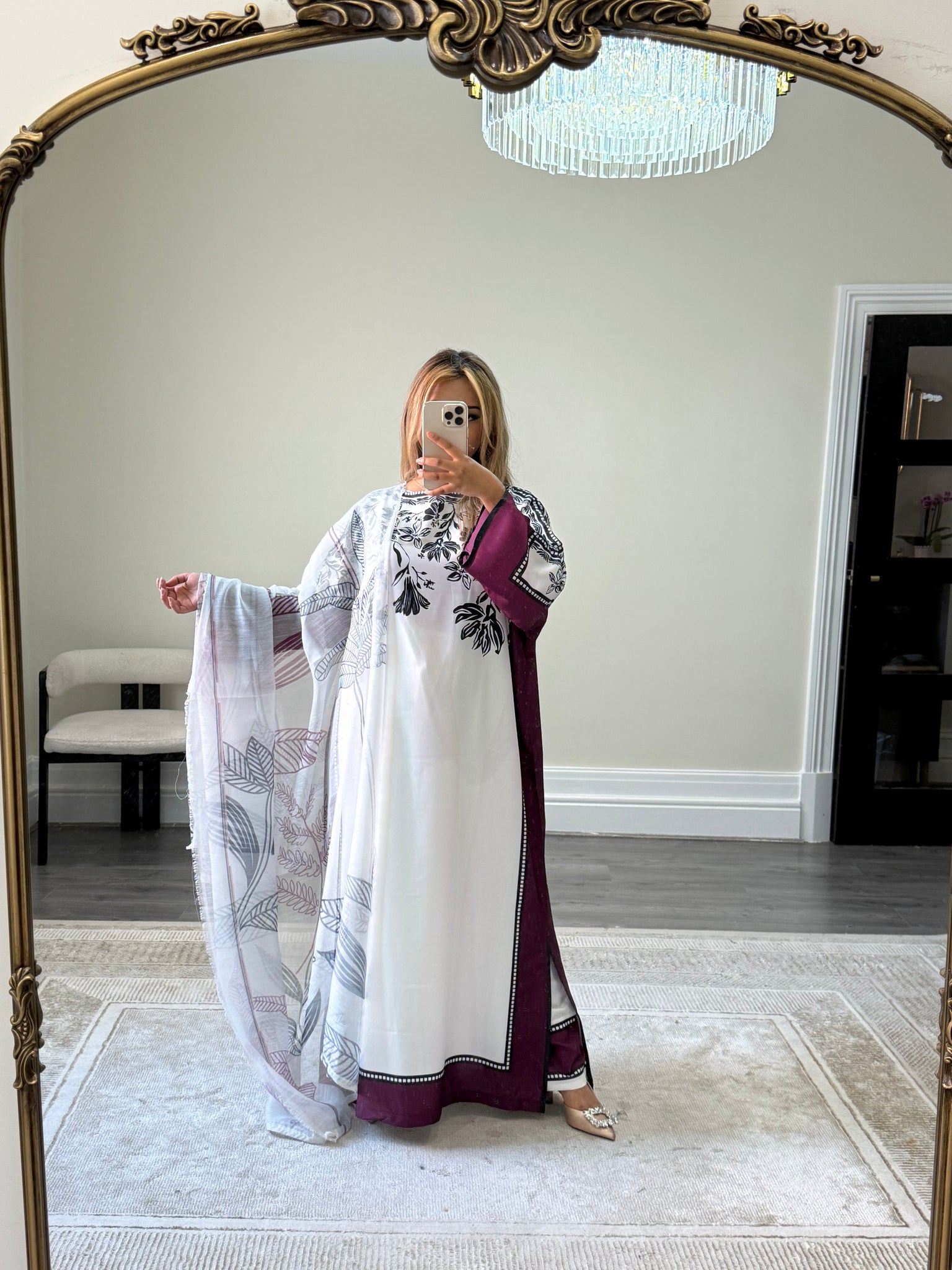 Varzah kaftan style long shirt with khadi net duppata and wide leg trouser