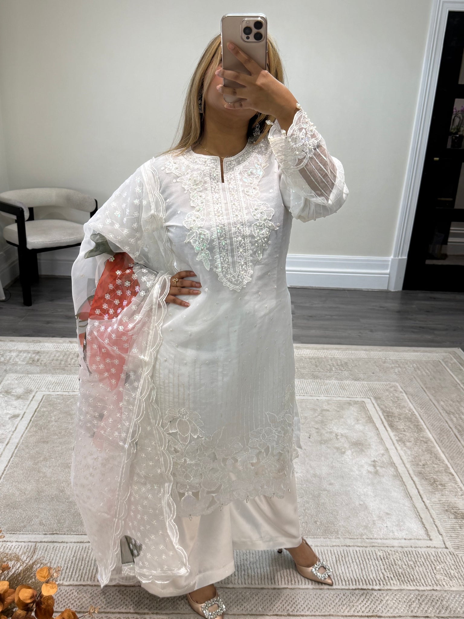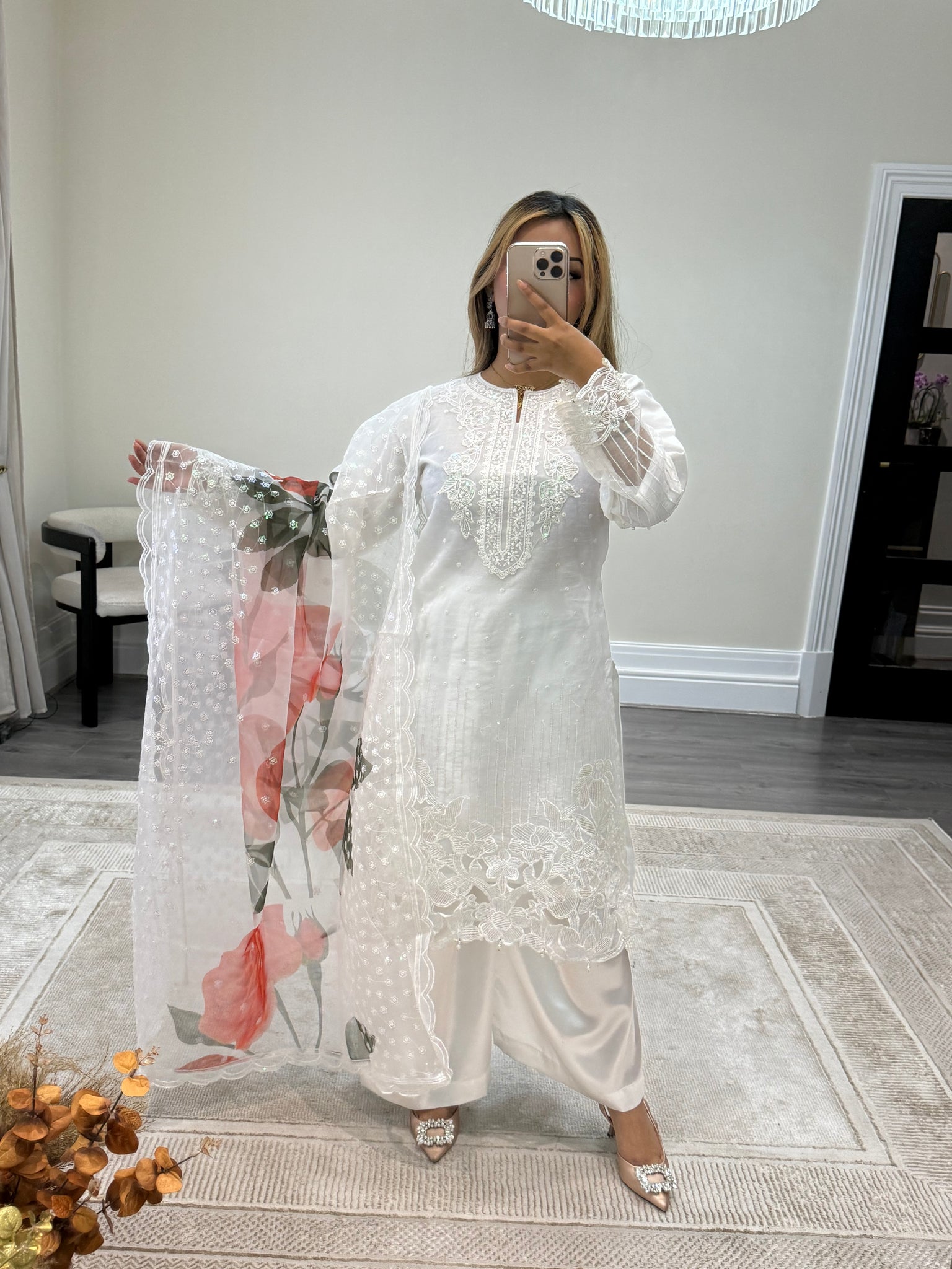 White embrofierrd shirt with pearl and sequin embellishments and floral printed duppata with embroidered and sequin work on duppats silk wide leg trouser