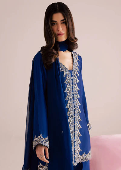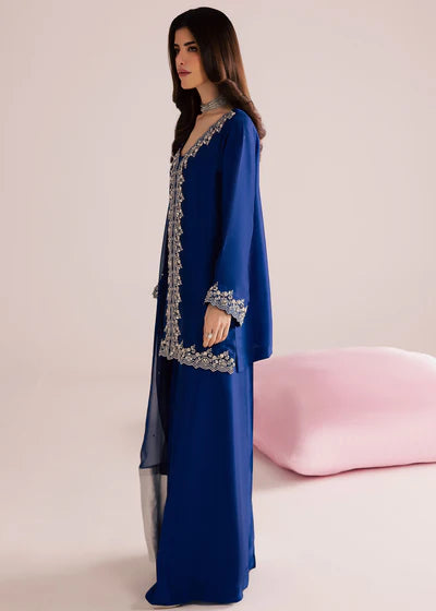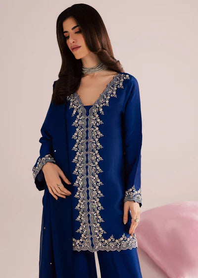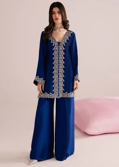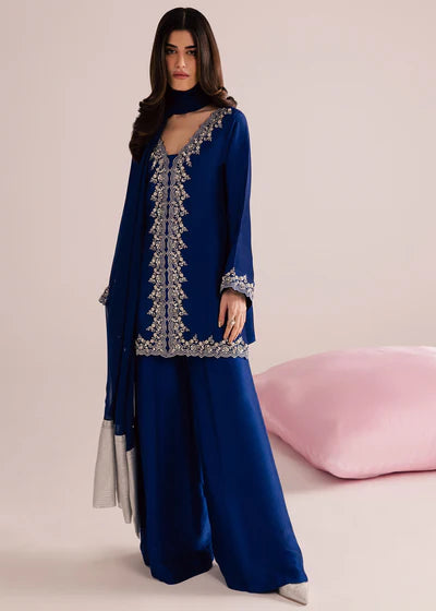 A vision of effortless sophistication, this deep sapphire blue ensemble is designed for evenings that call for quiet glamour. Crafted in a fluid, lightweight fabric, the silhouette flows gracefully with every movement, creating an elongated and refined look. The front open cut tunic is adorned with delicate silver embroidery tracing the neckline, front panel, sleeves, and hem — a timeless contrast that highlights the richness of the blue base. The embellishment is intricate yet restrained, lending the outfit an heirloom-inspired charm without overwhelming its modern appeal. Paired with wide-leg trousers, the ensemble balances structure and softness, offering both comfort and elegance. The chiffon dupatta, finished with a silver border, adds a final touch of romance, draping beautifully for a polished finish.