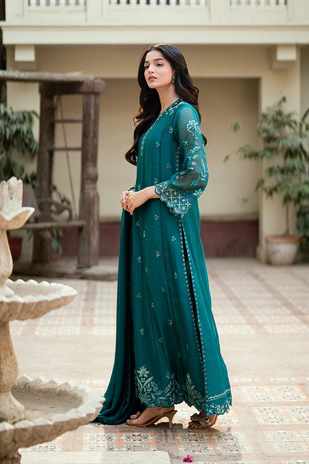 Emerald Empress—Crafted in pure khaddi net, a flared shirt pairs beautifully with classic straight pants. The lightweight viscous silk dupatta completes the look with grace and charm.