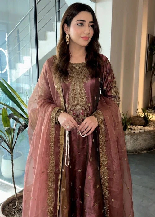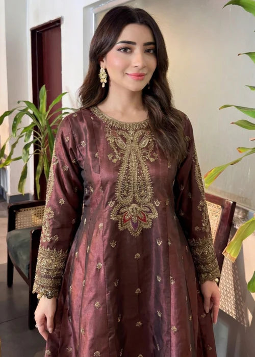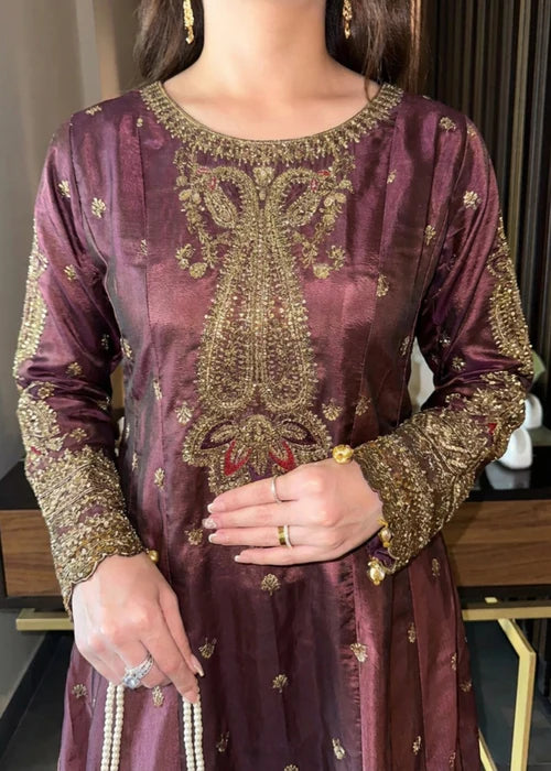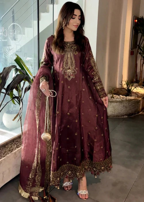 Laal Clothing's 3-piece Festive Ensemble. This sophisticated party wear set features a flared maxi top and straight trouser crafted from luxurious Grape wine Silk. Intricate embroidery work elevates the outfit, which is completed by a delicate Organza Dupatta. Perfect for year-round celebrations, this set is the epitome of elegance.