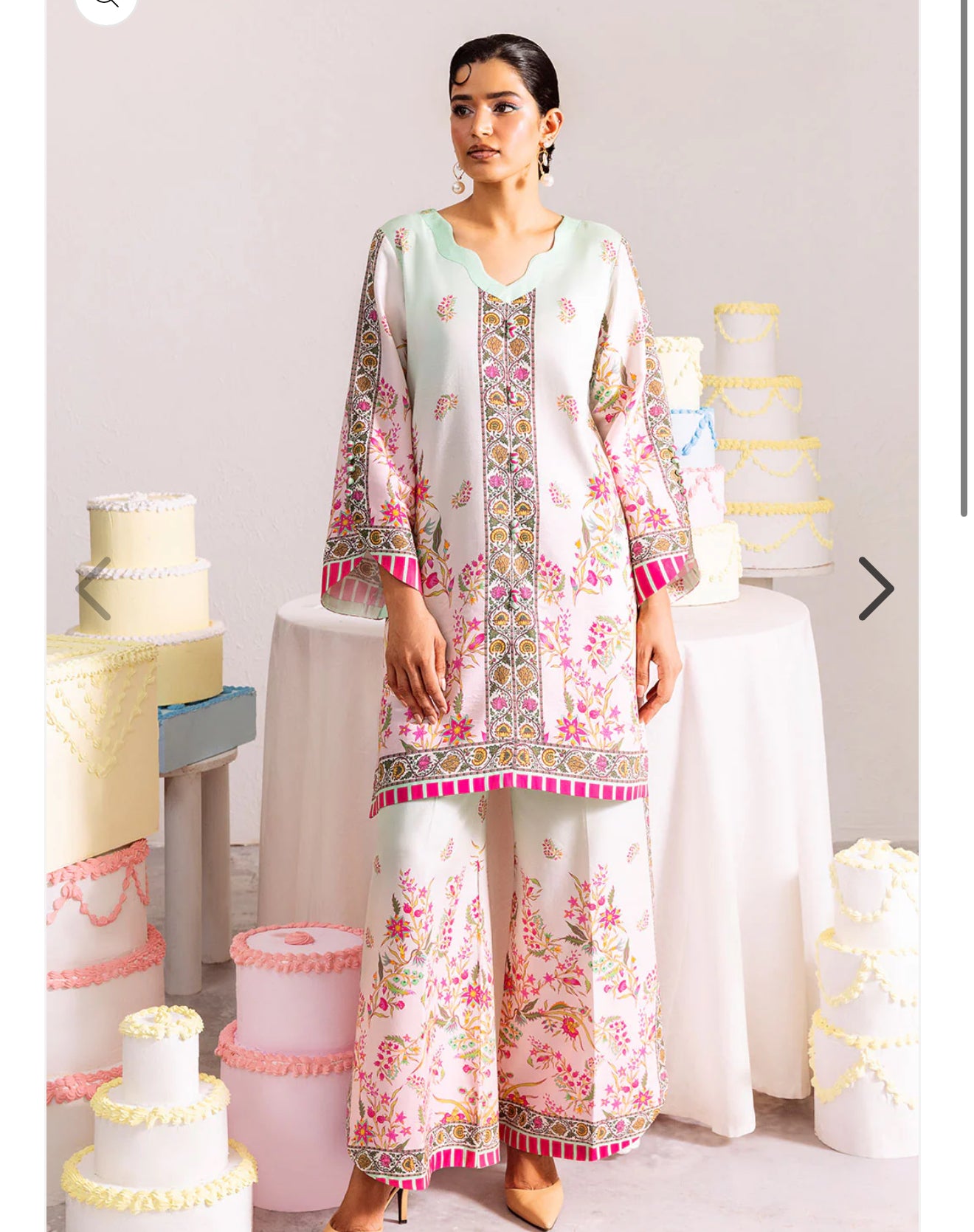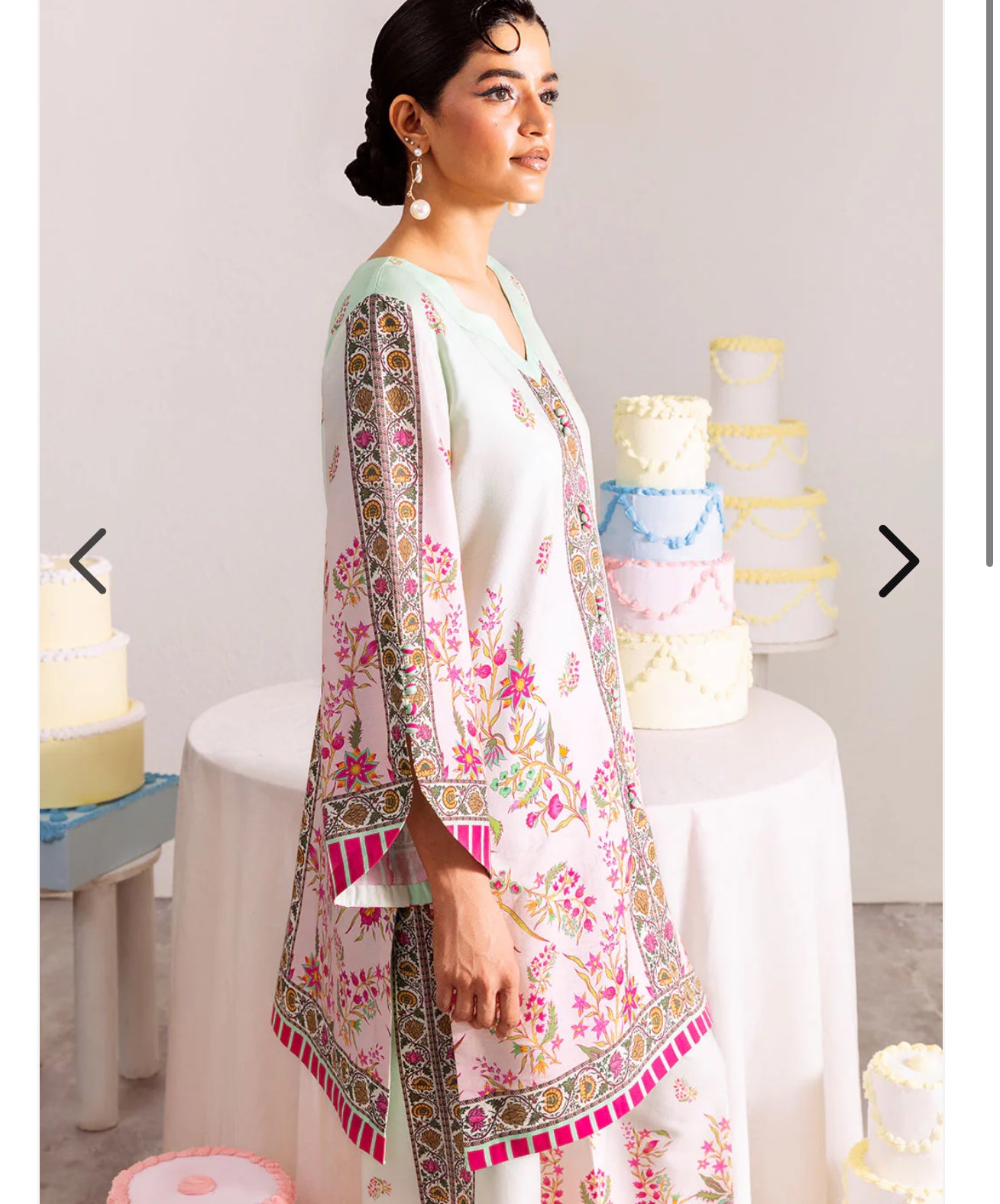 Pastel-hued printed co-ord adorned with vibrant delicate floral motifs and intricate border