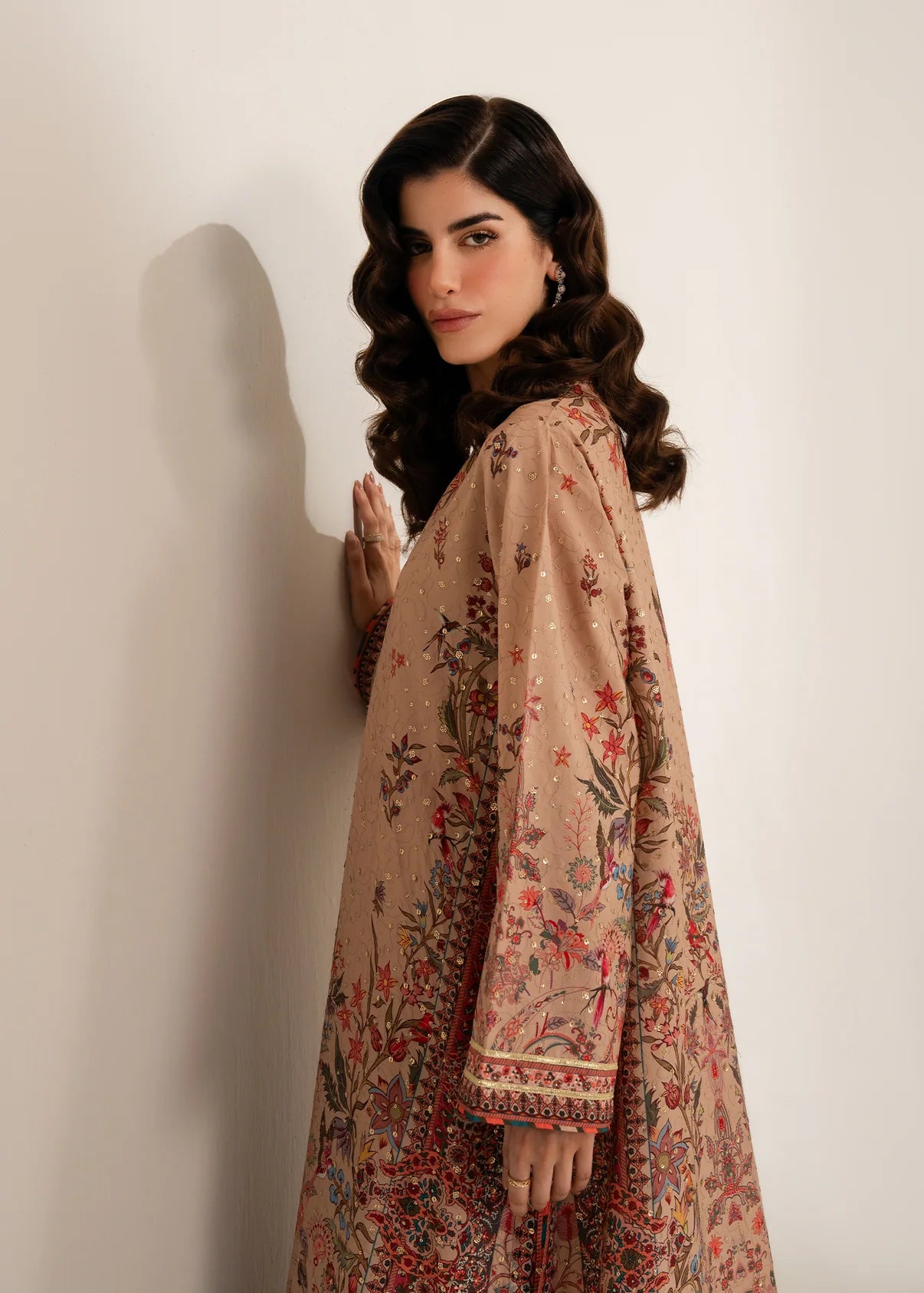 Embroidered beige skin printed crepe A-line shirt, adorned with intricate floral embroidery and golden sequin accents all over. Features an overlapping neckline finished with golden triangular gota patti lace, sleeves styled with gota patti and printed chattapati, and side openings detailed with matching printed chattapati and a coordinating border.