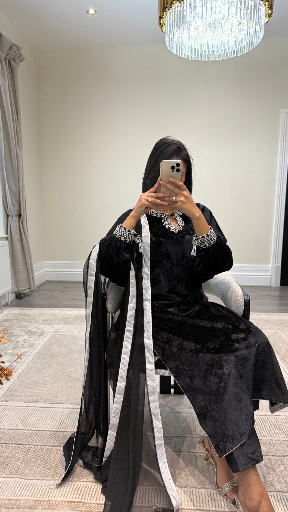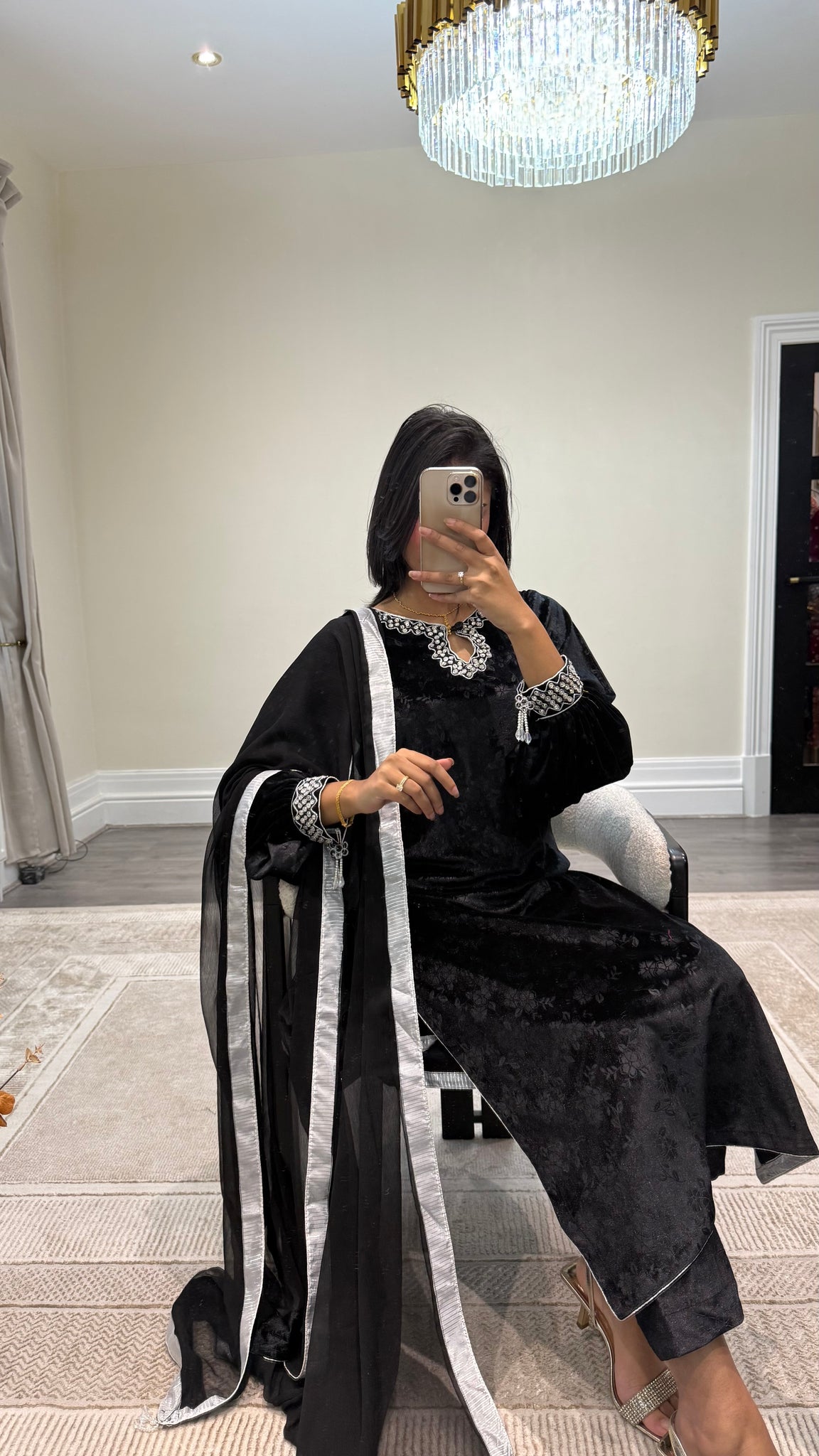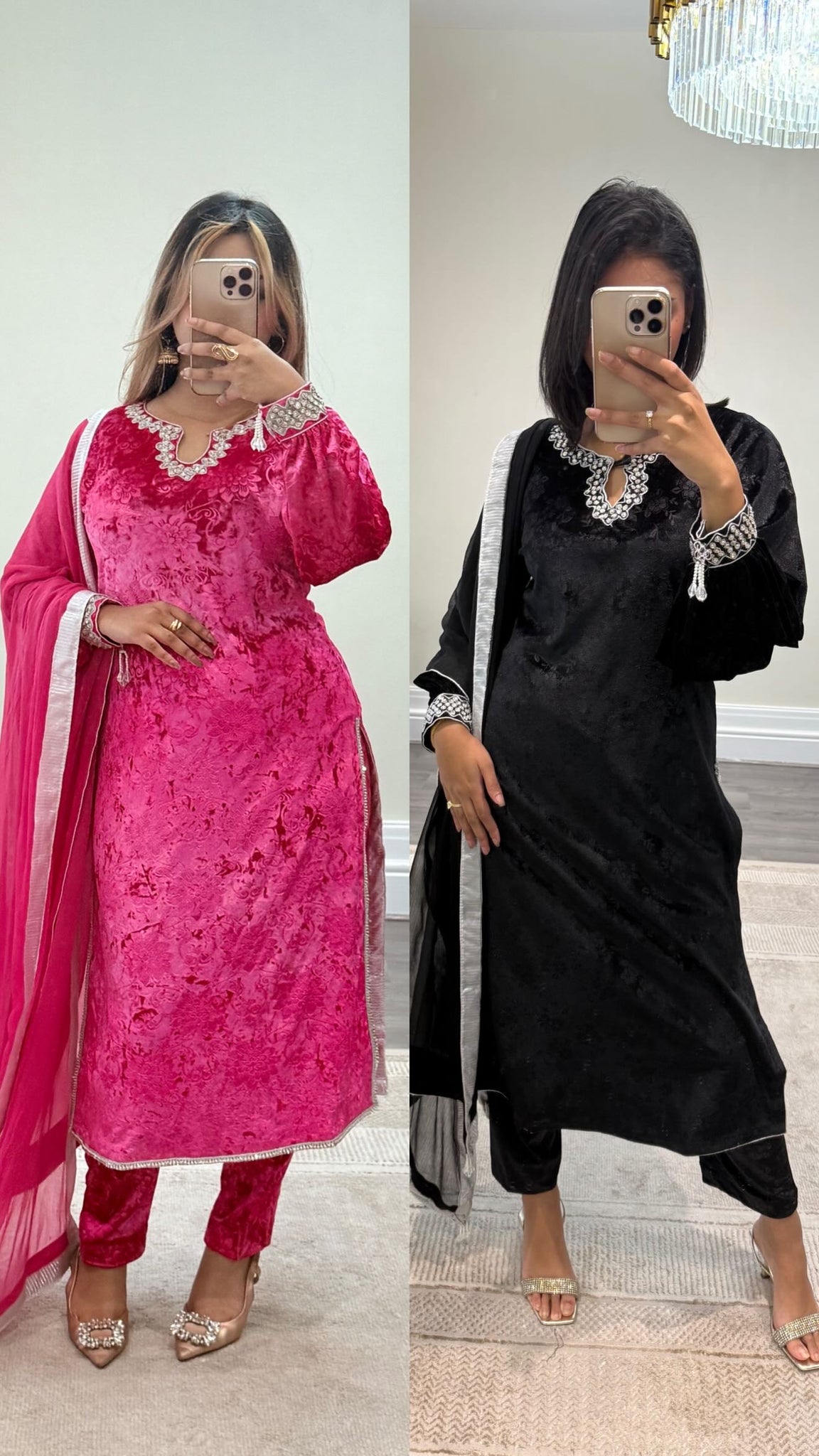 Black/pink velvet embroidered suit with velvet trouser and chiffon duppata
