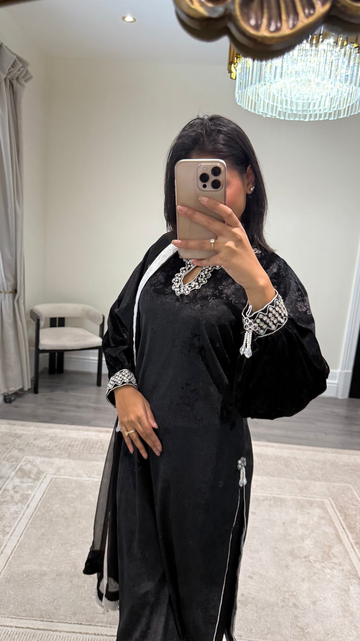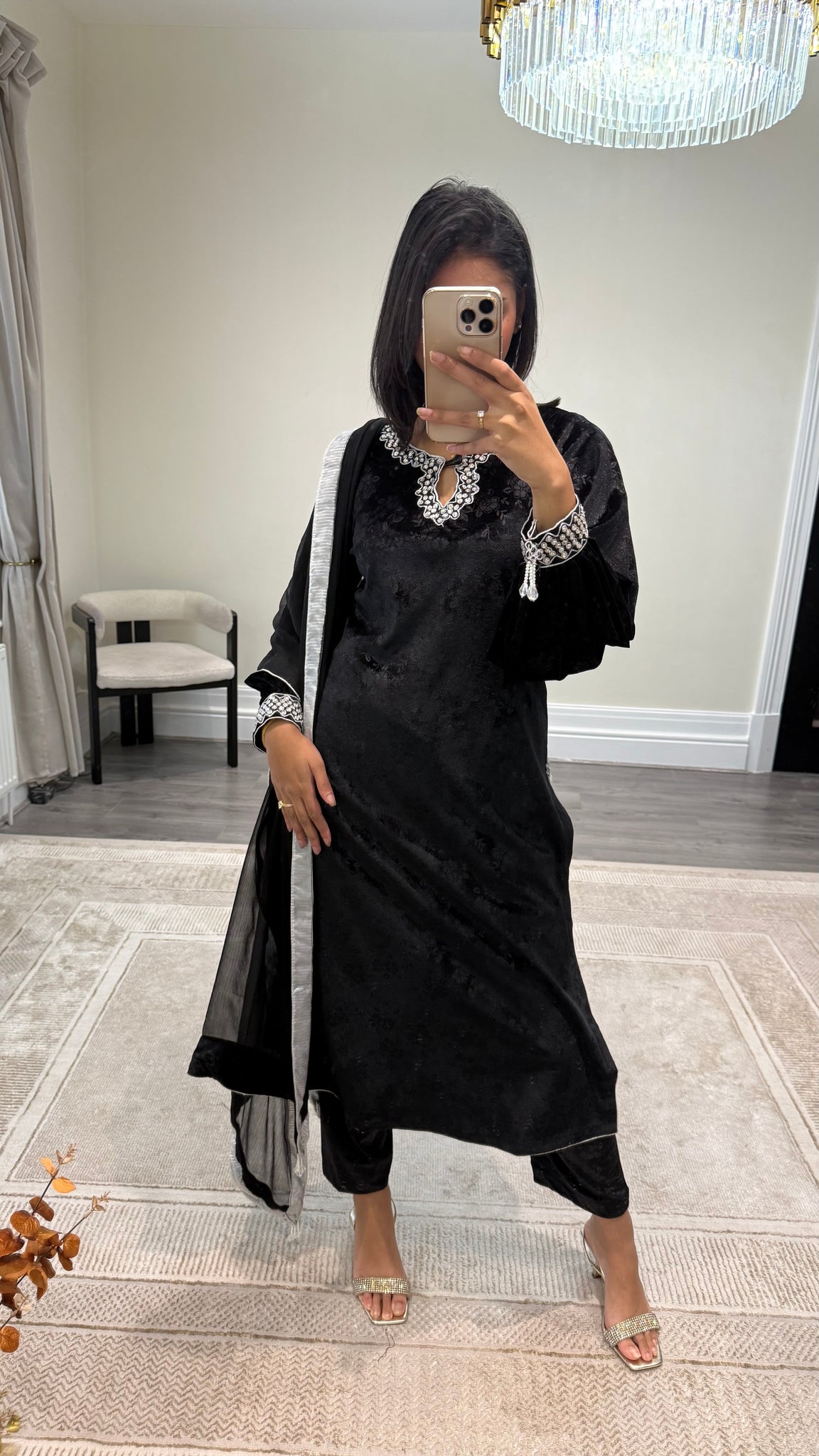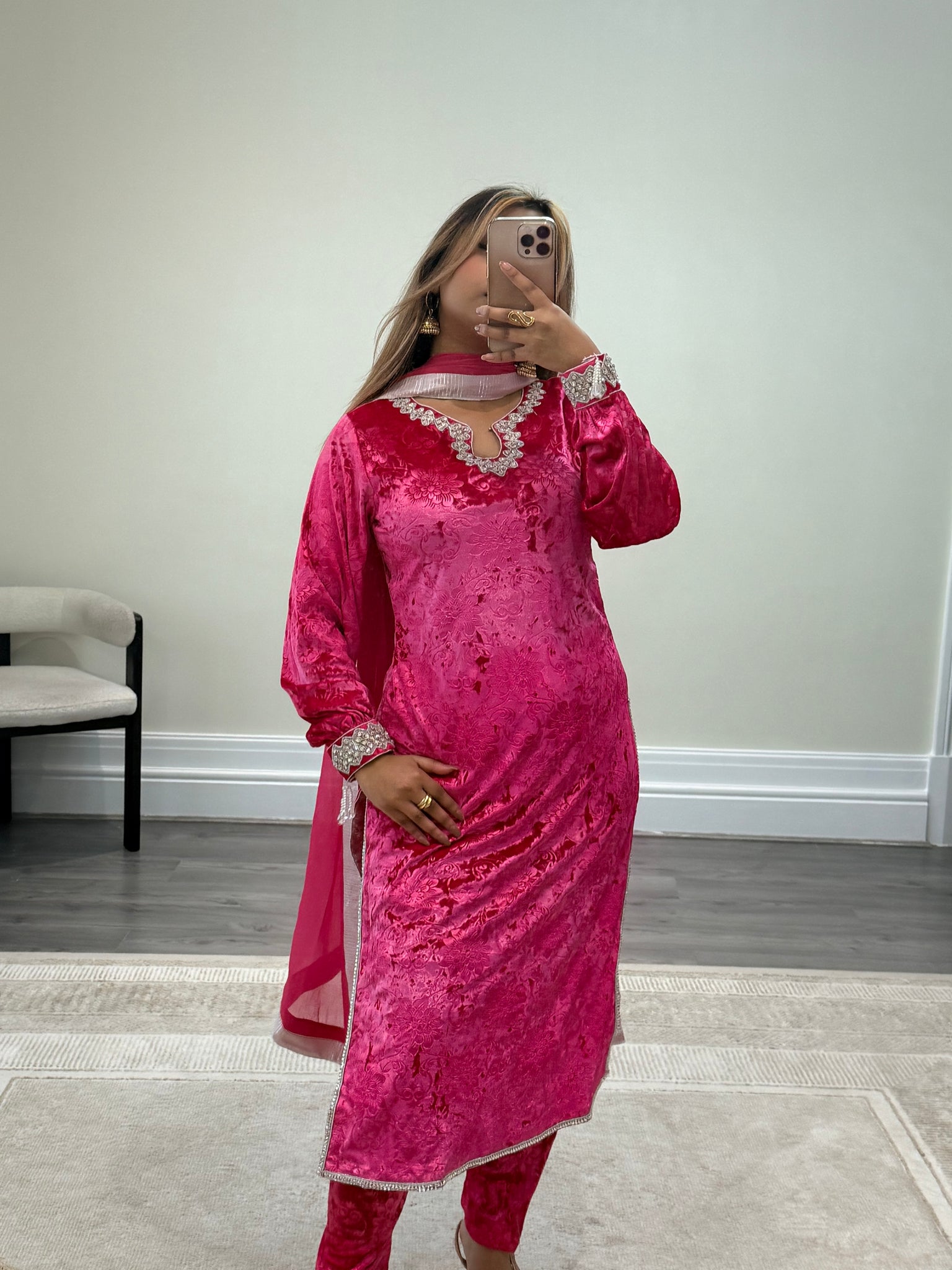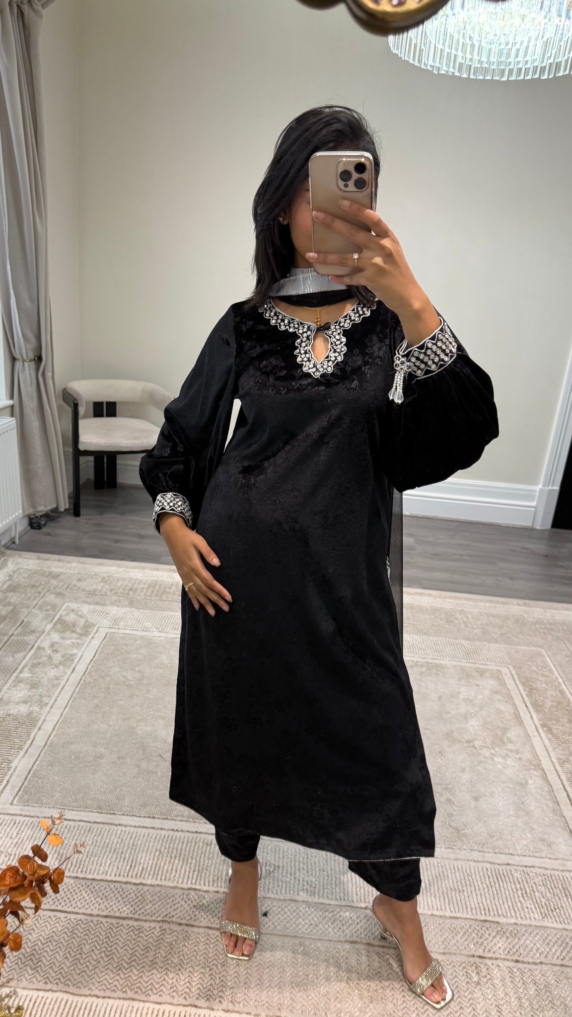 Black/pink velvet embroidered suit with velvet trouser and chiffon duppata