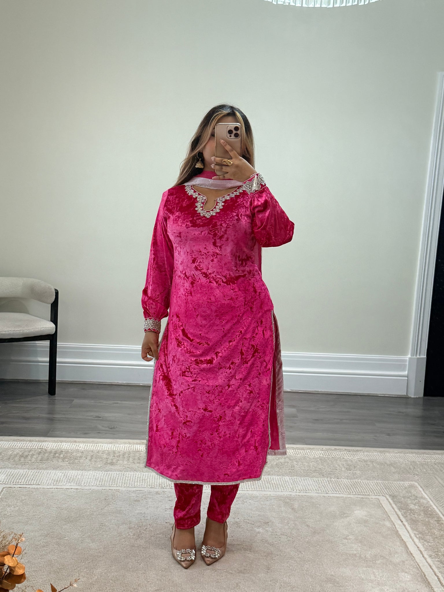 Velvet embroidered suit with sequin work. Embroidered chiffon duppata. Velvet trouser.