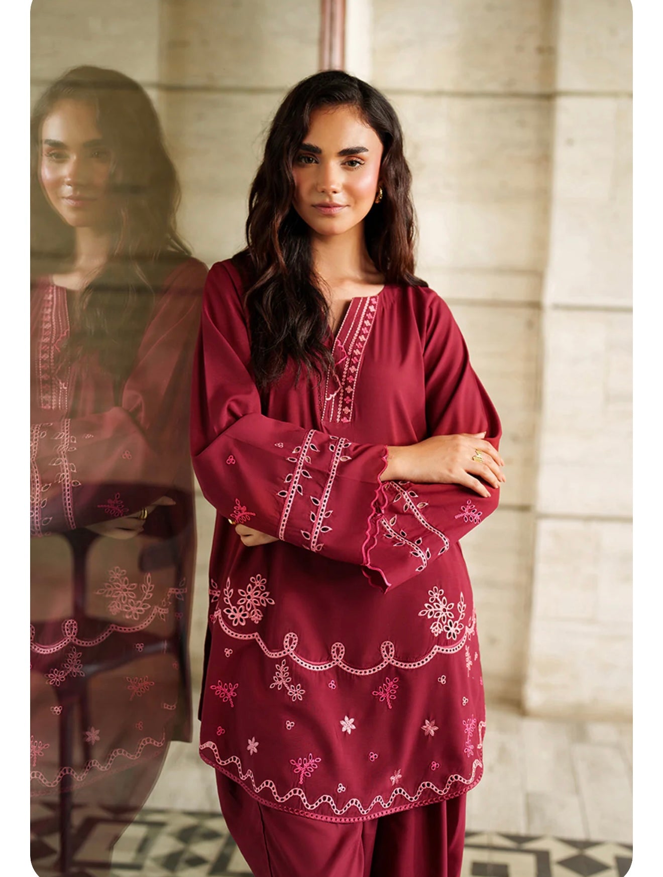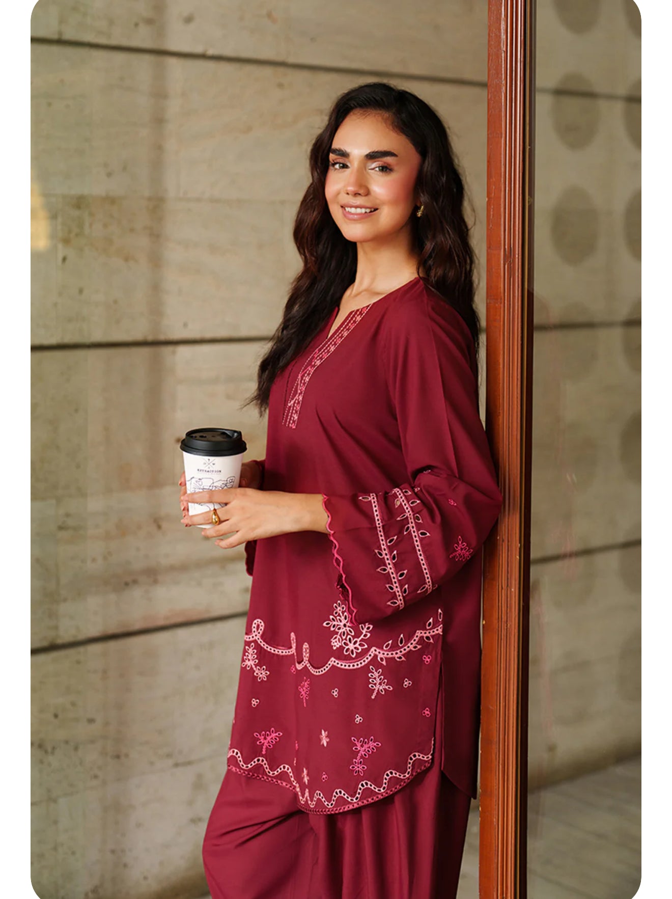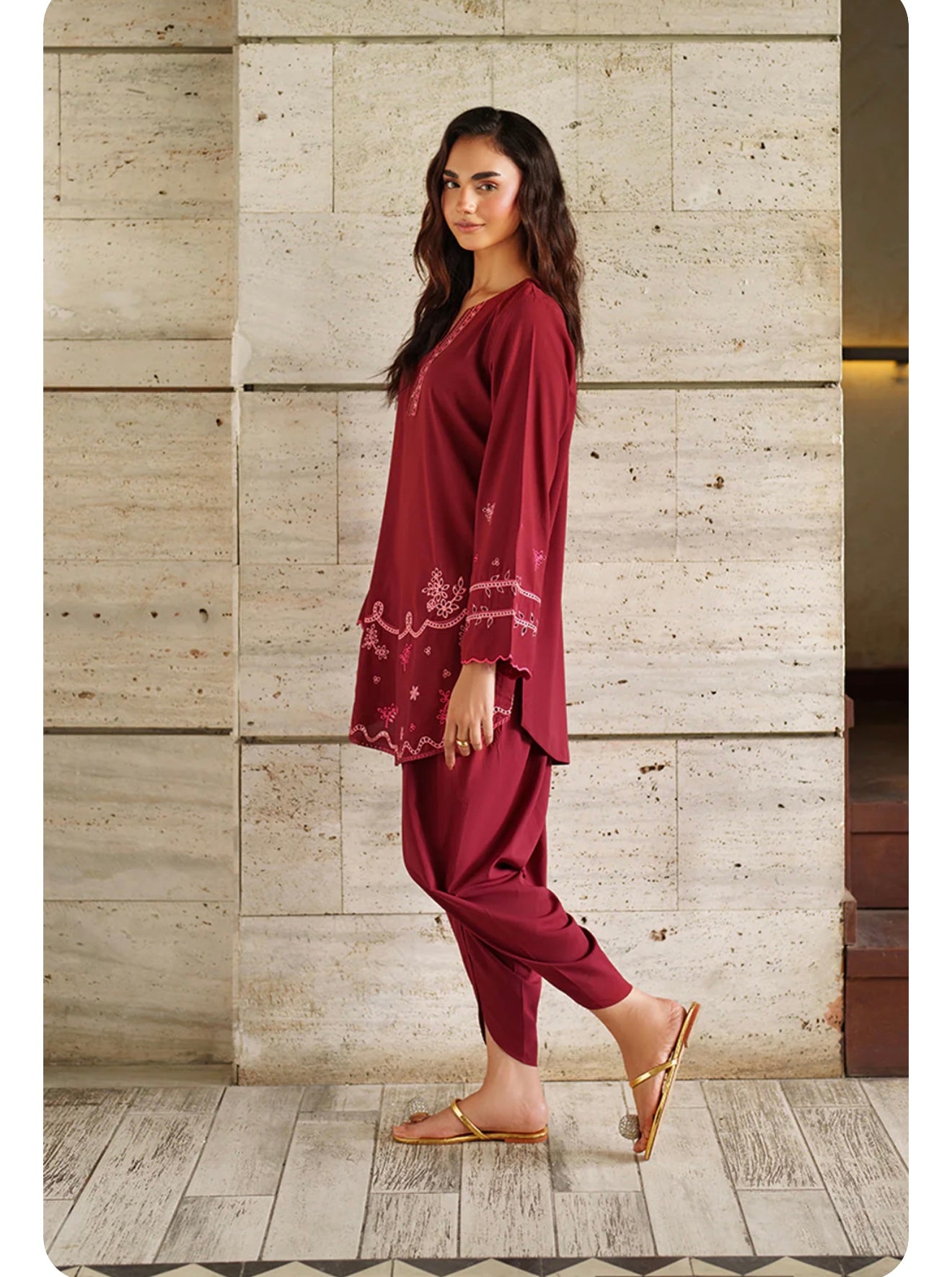 Blaze Berry, an embroidered matching coord set in a deep maroon, crafted to add a touch of bold sophistication to your everyday wardrobe.