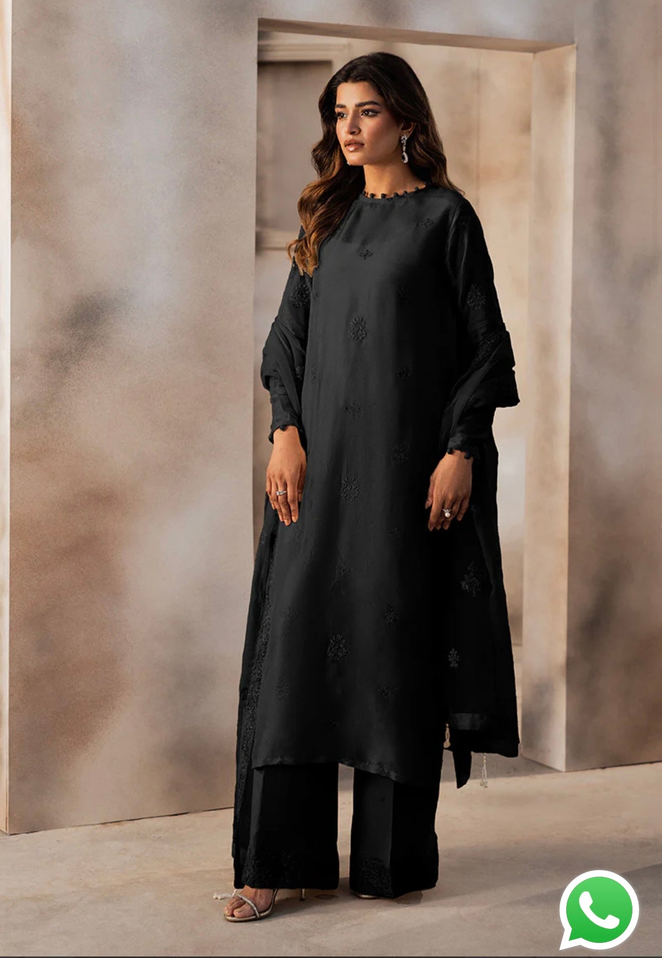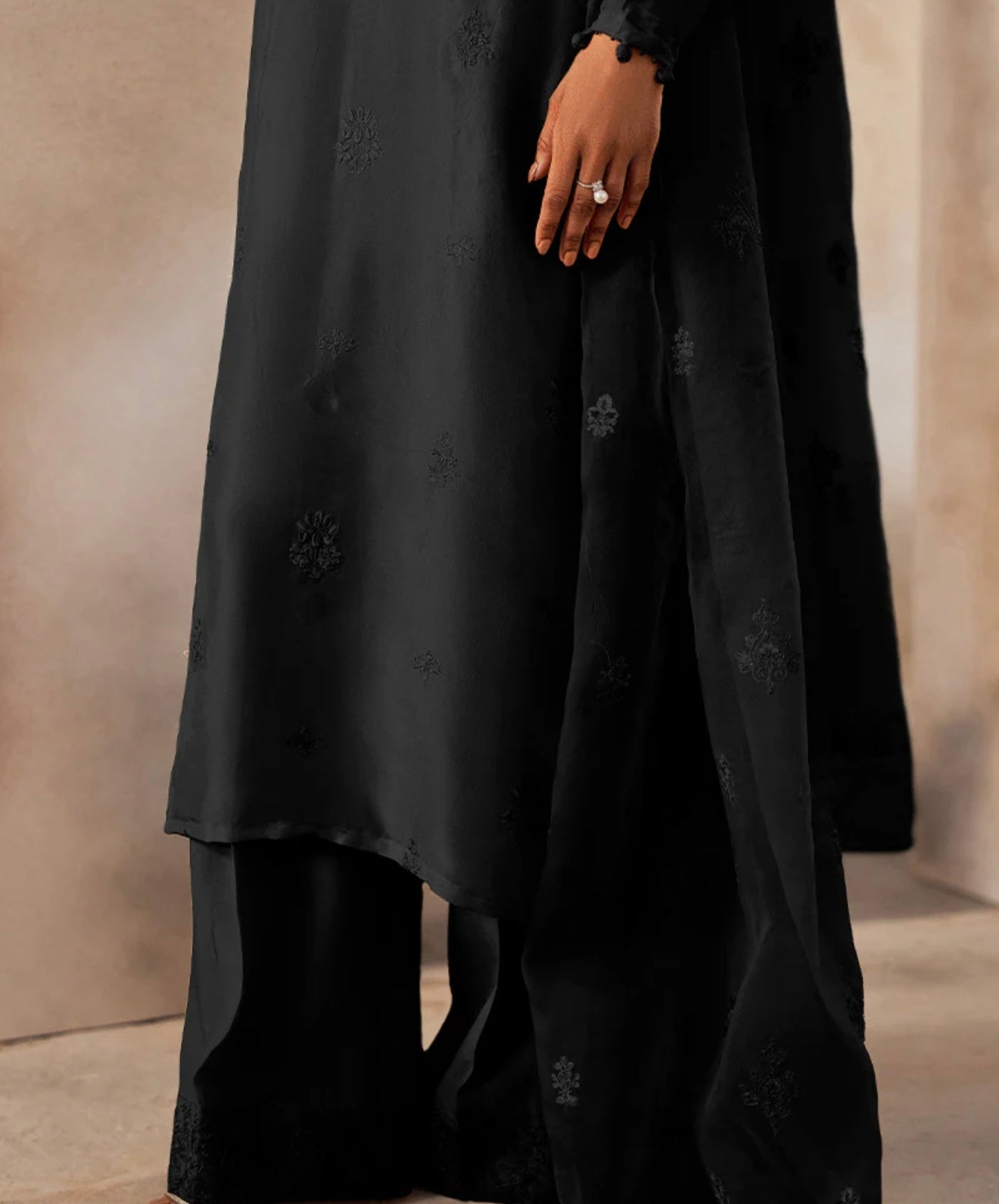 Step into refined elegance with this modern interpretation of tradition. The long shirt, adorned with delicate spray embroidery and intricate embellishments, sets the tone for festive celebrations. Paired with culottes finished with richly embroidered hems and an organza dupatta enhanced with embellished motifs, this ensemble creates a graceful, contemporary silhouette with just the right hint of allure. Perfect for festive gatherings, it embodies sophistication with a modern edge.