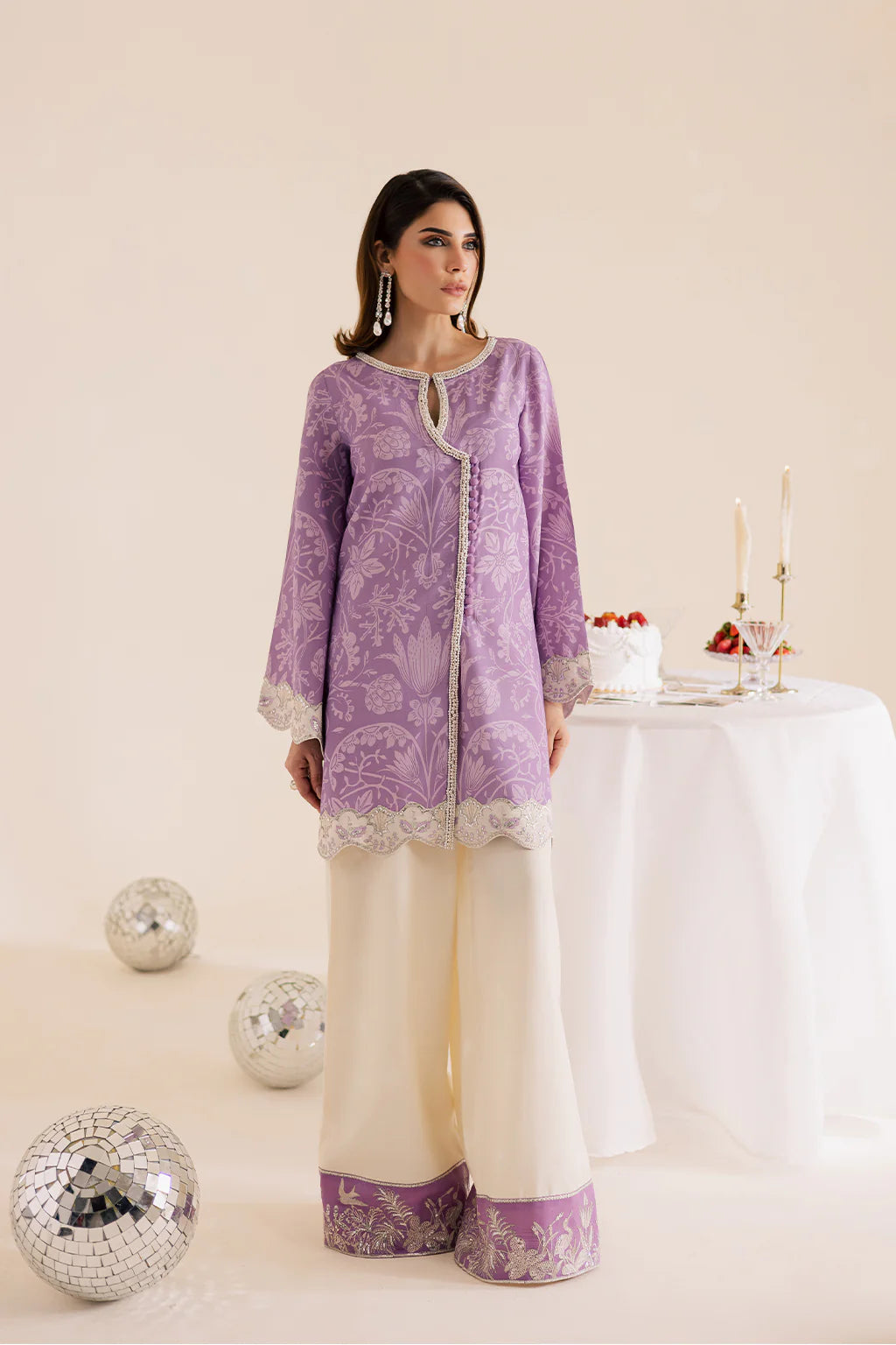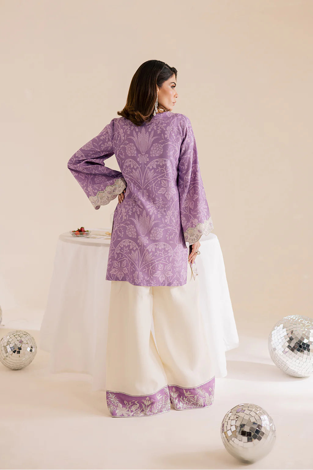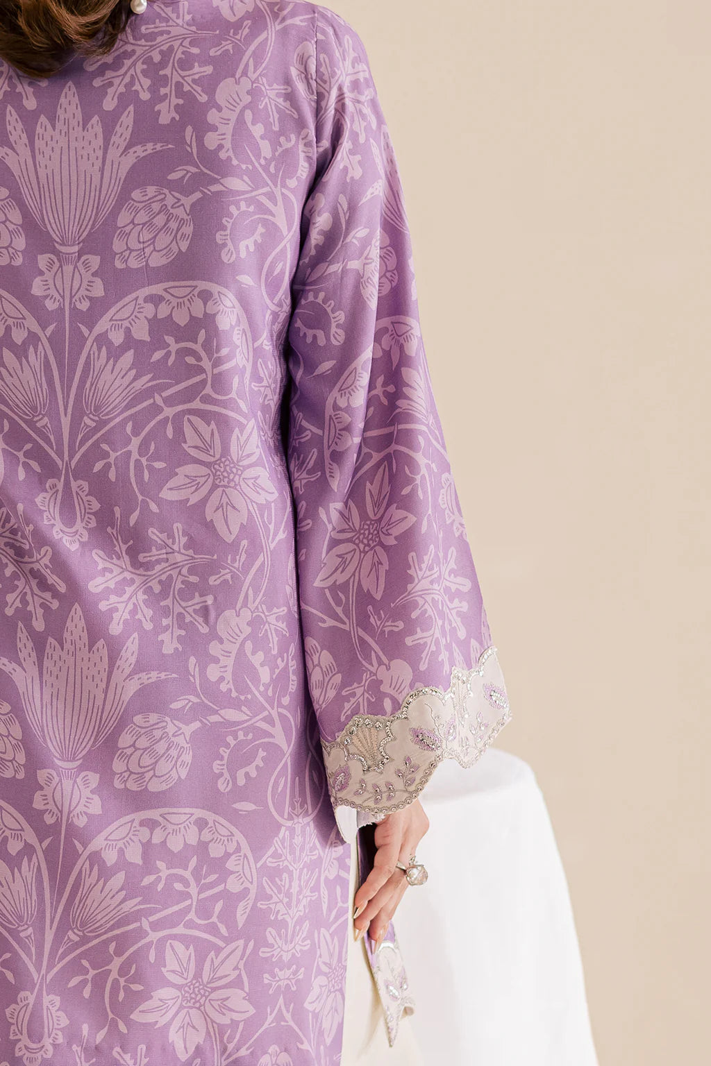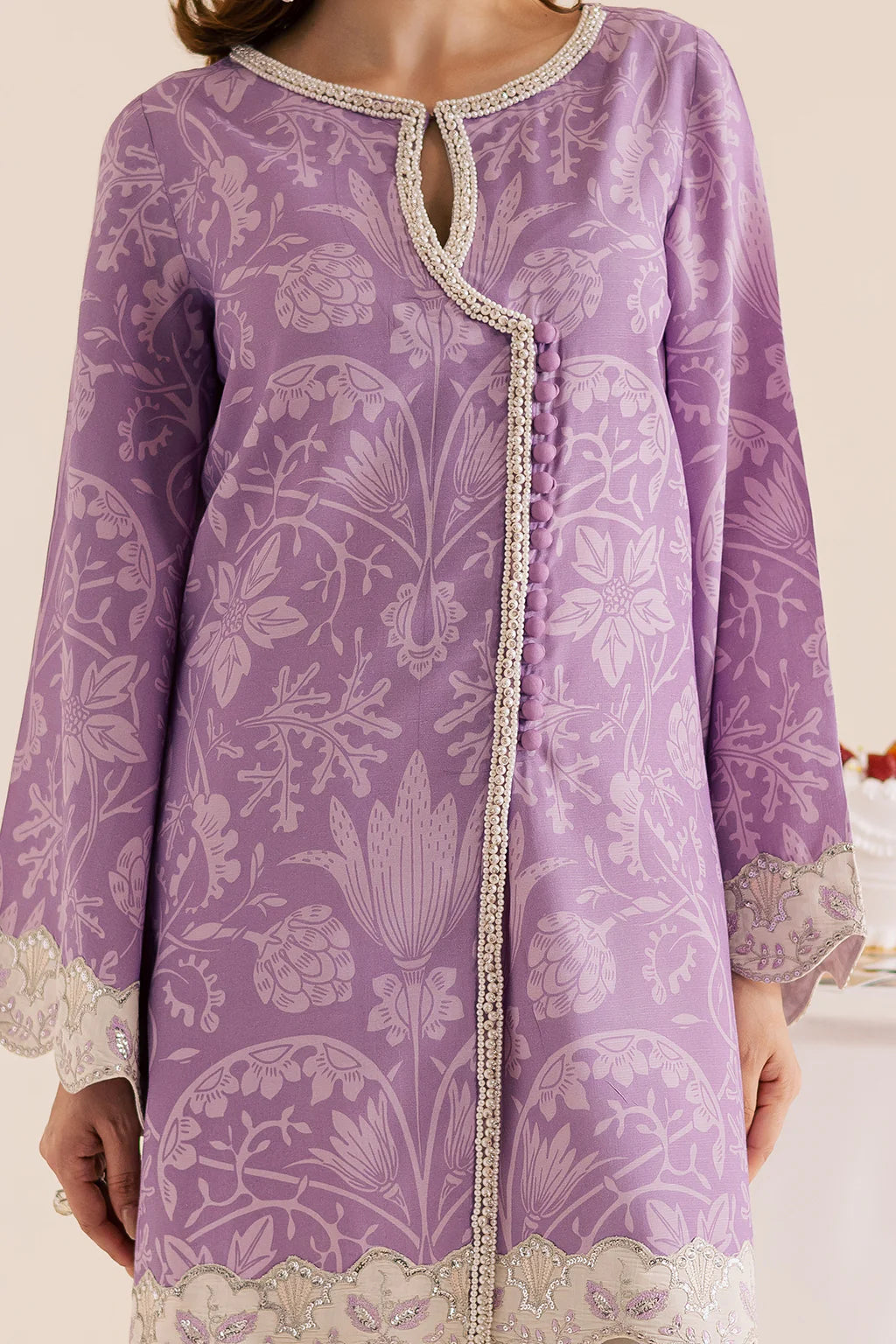A lilac lawn silk printed shirt with embroidery and embellishments, paired with off-white flared trousers