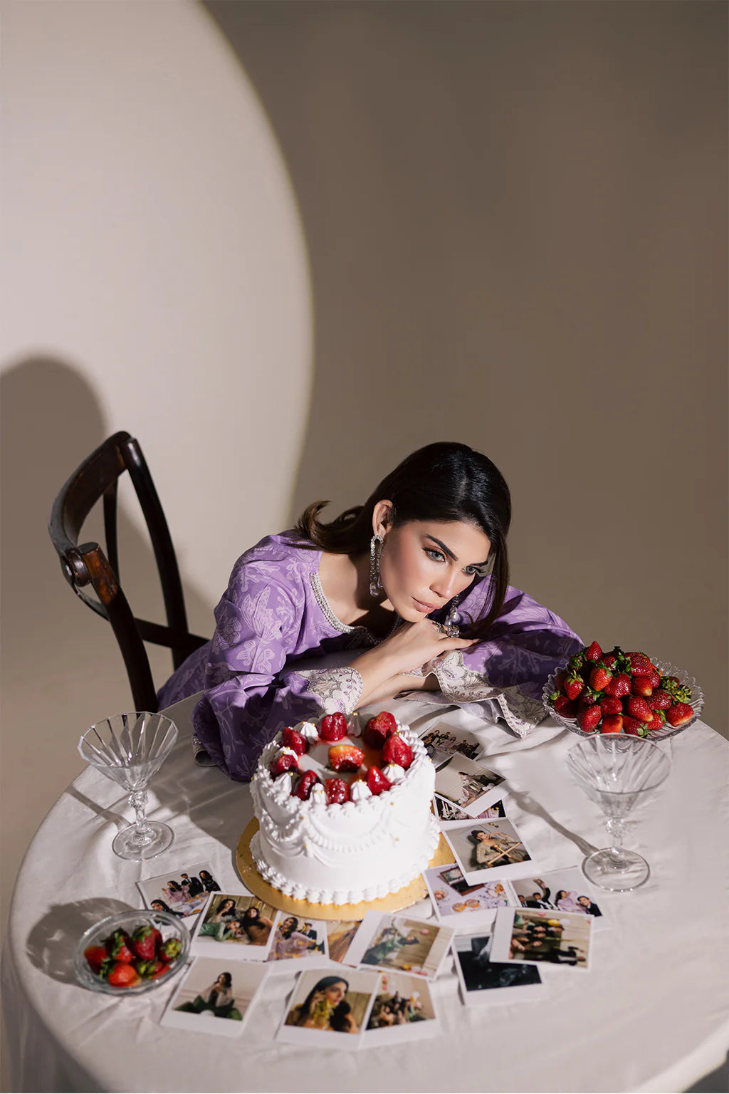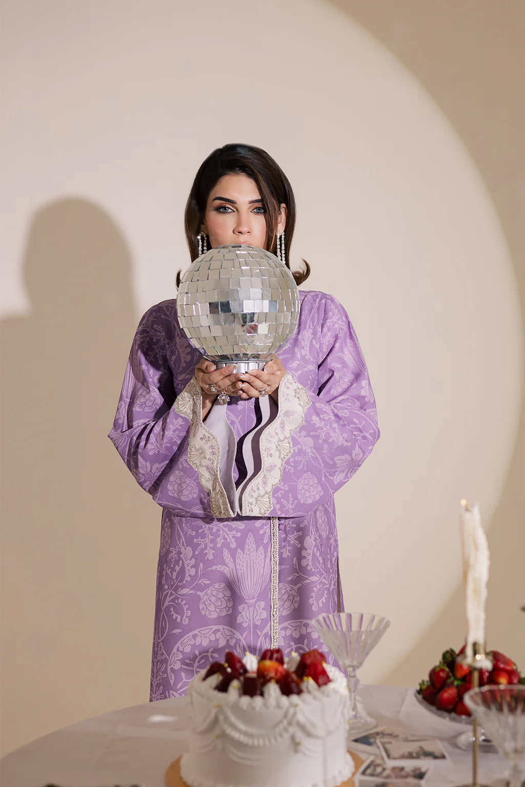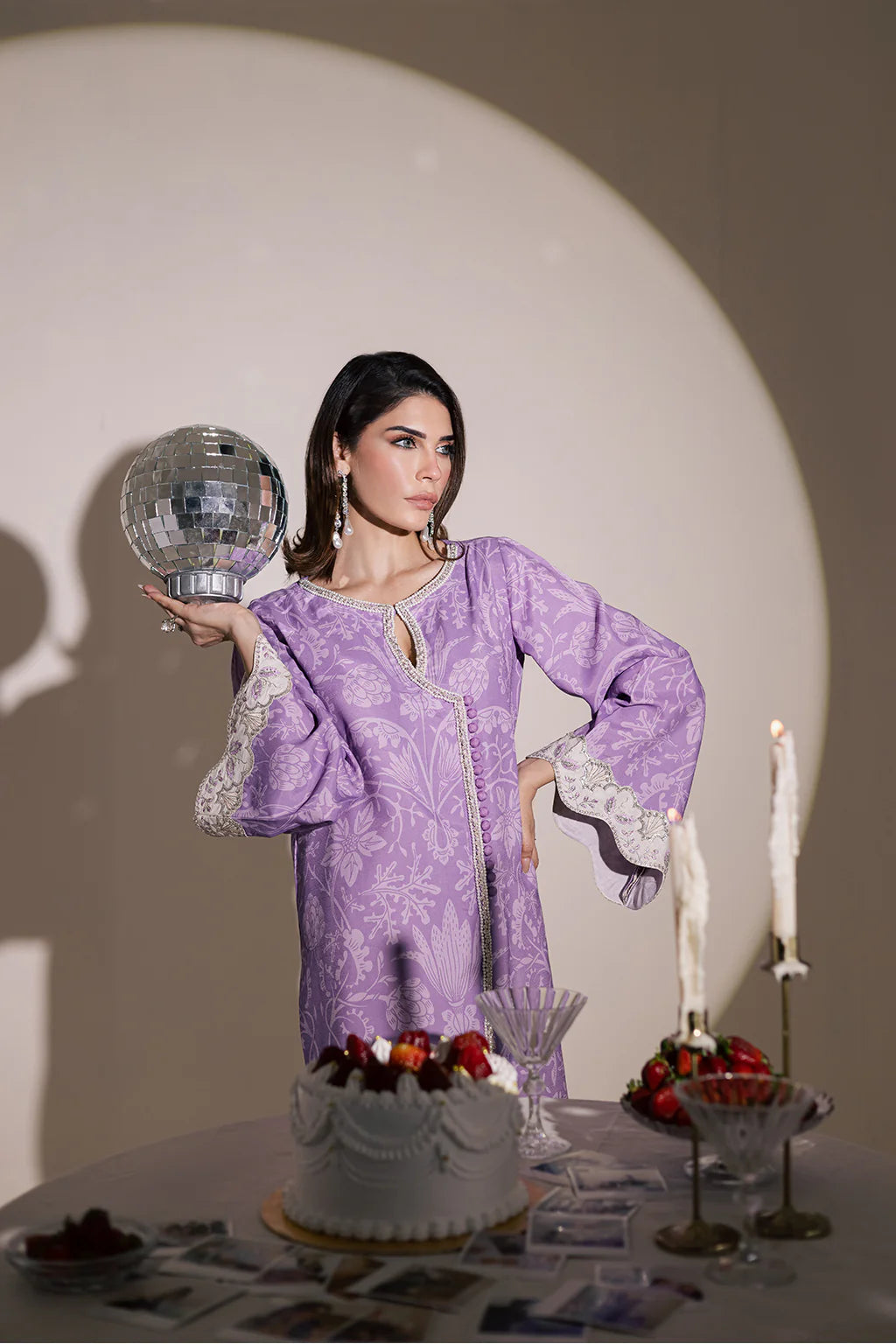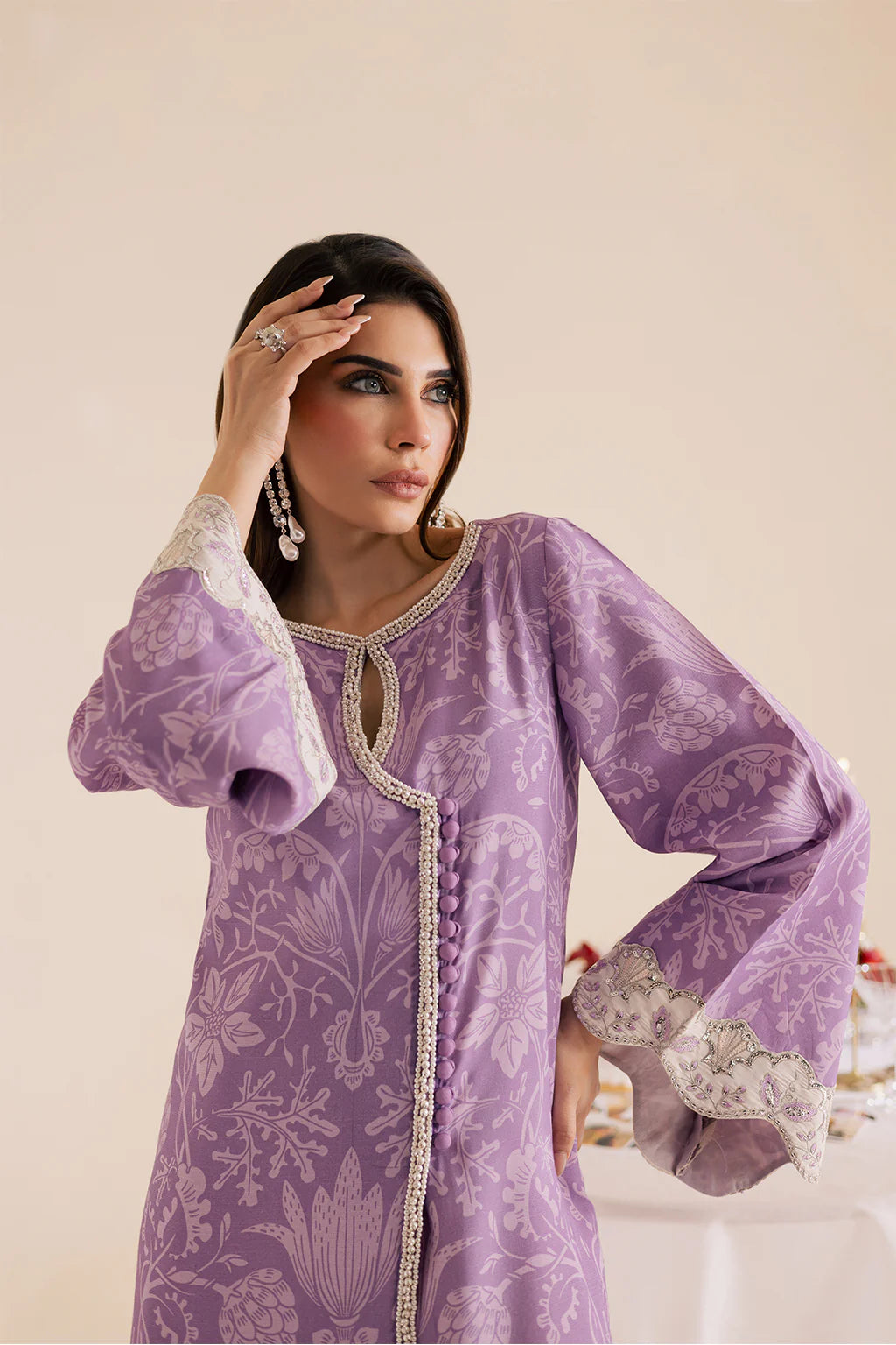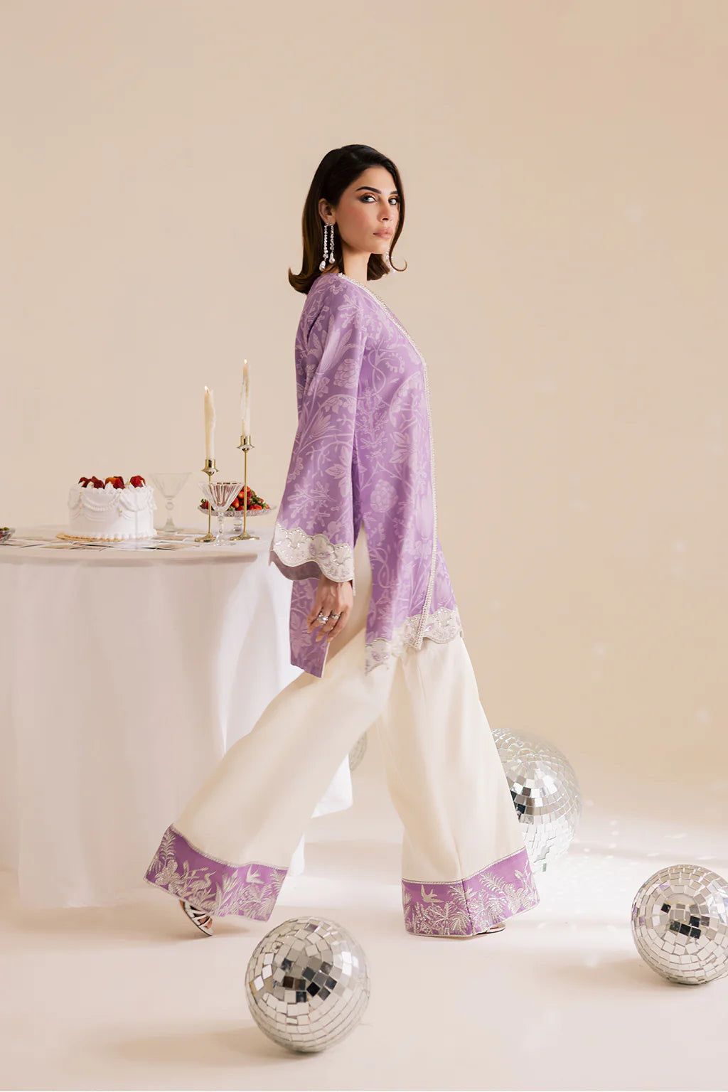 A lilac lawn silk printed shirt with embroidery and embellishments, paired with off-white flared trousers