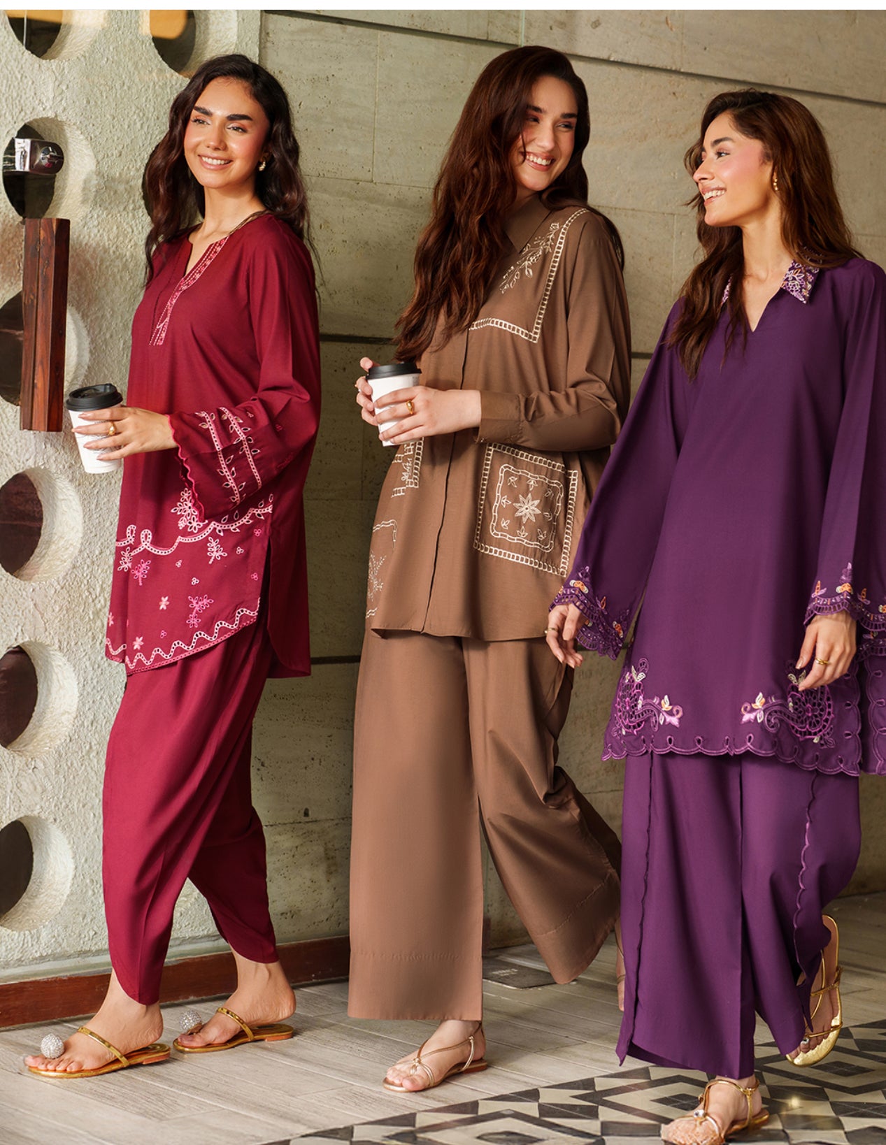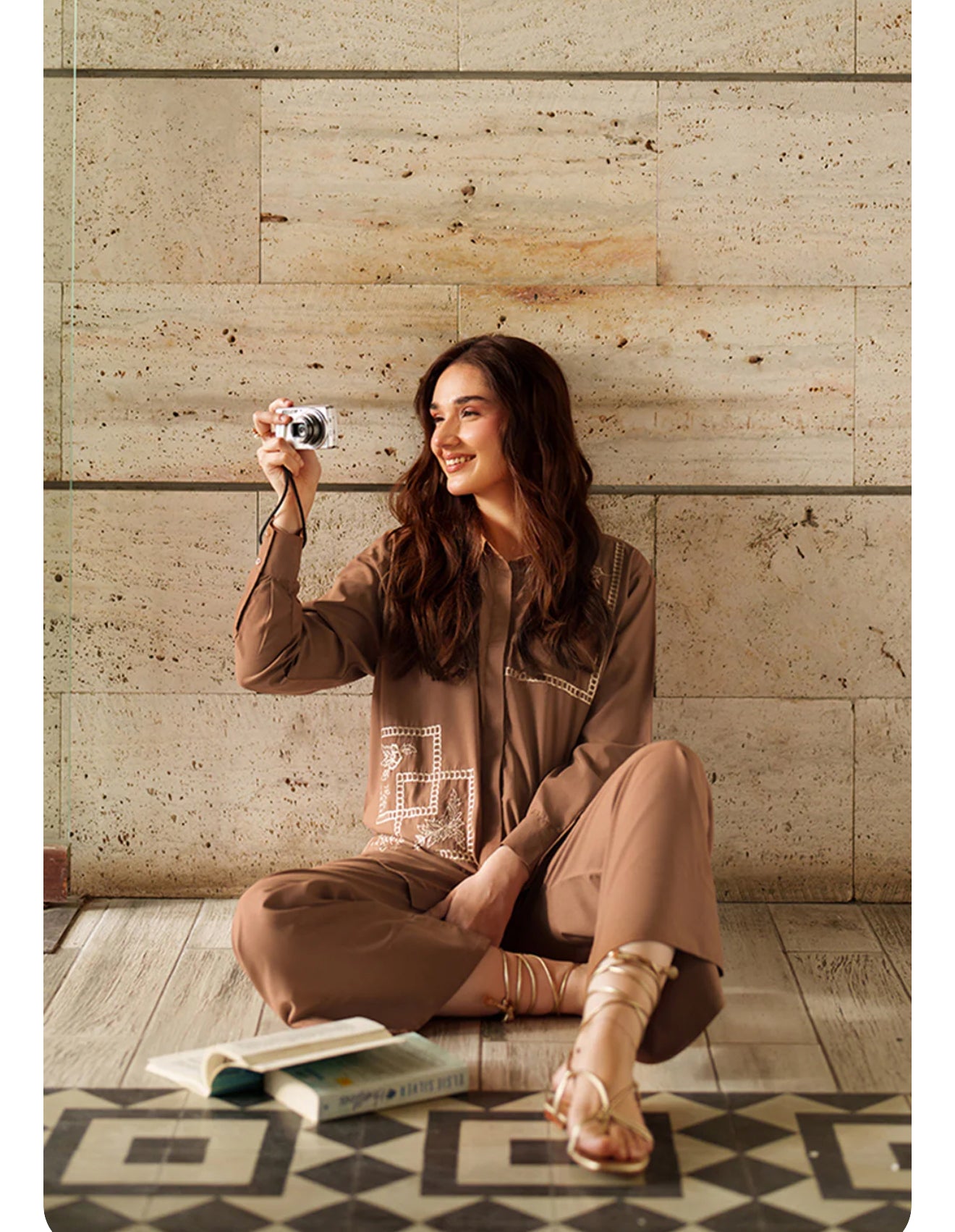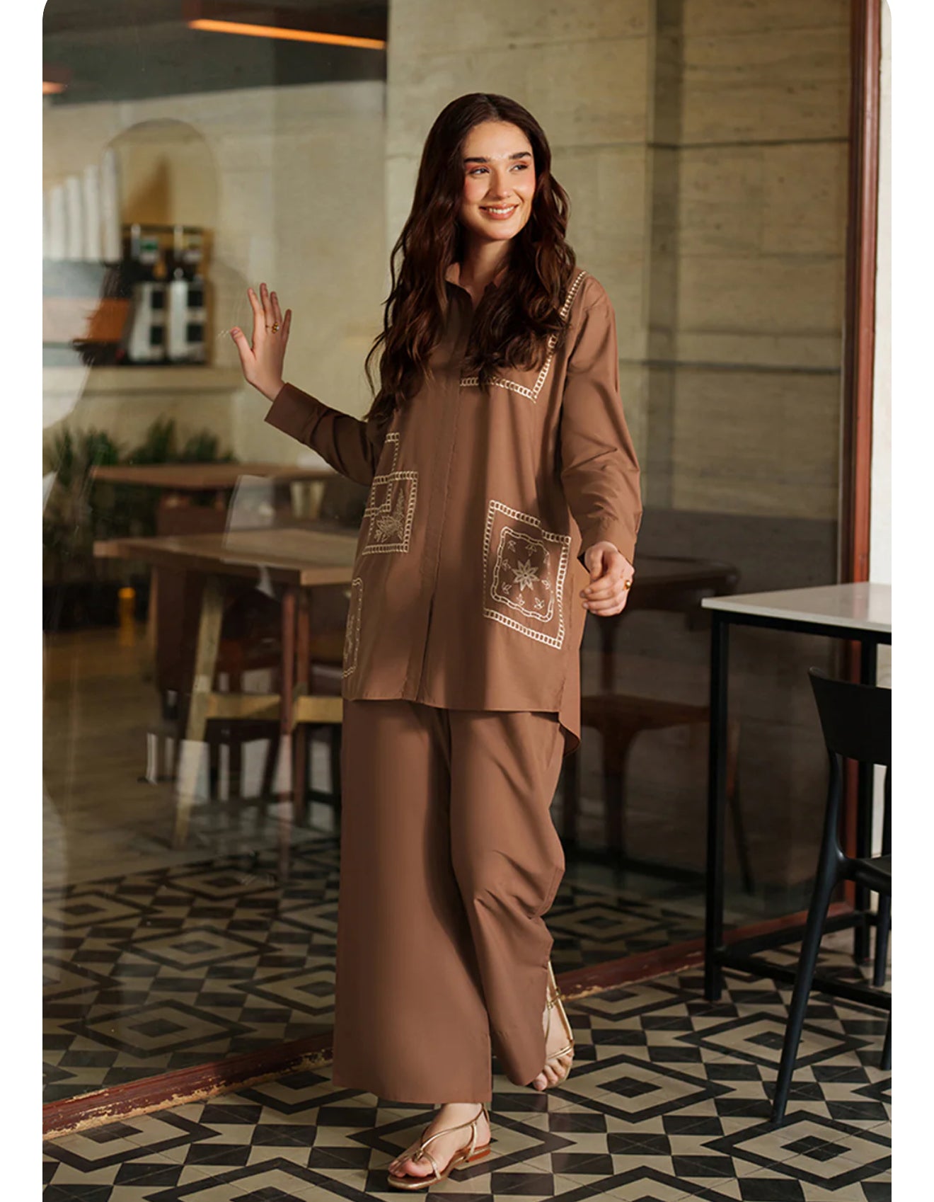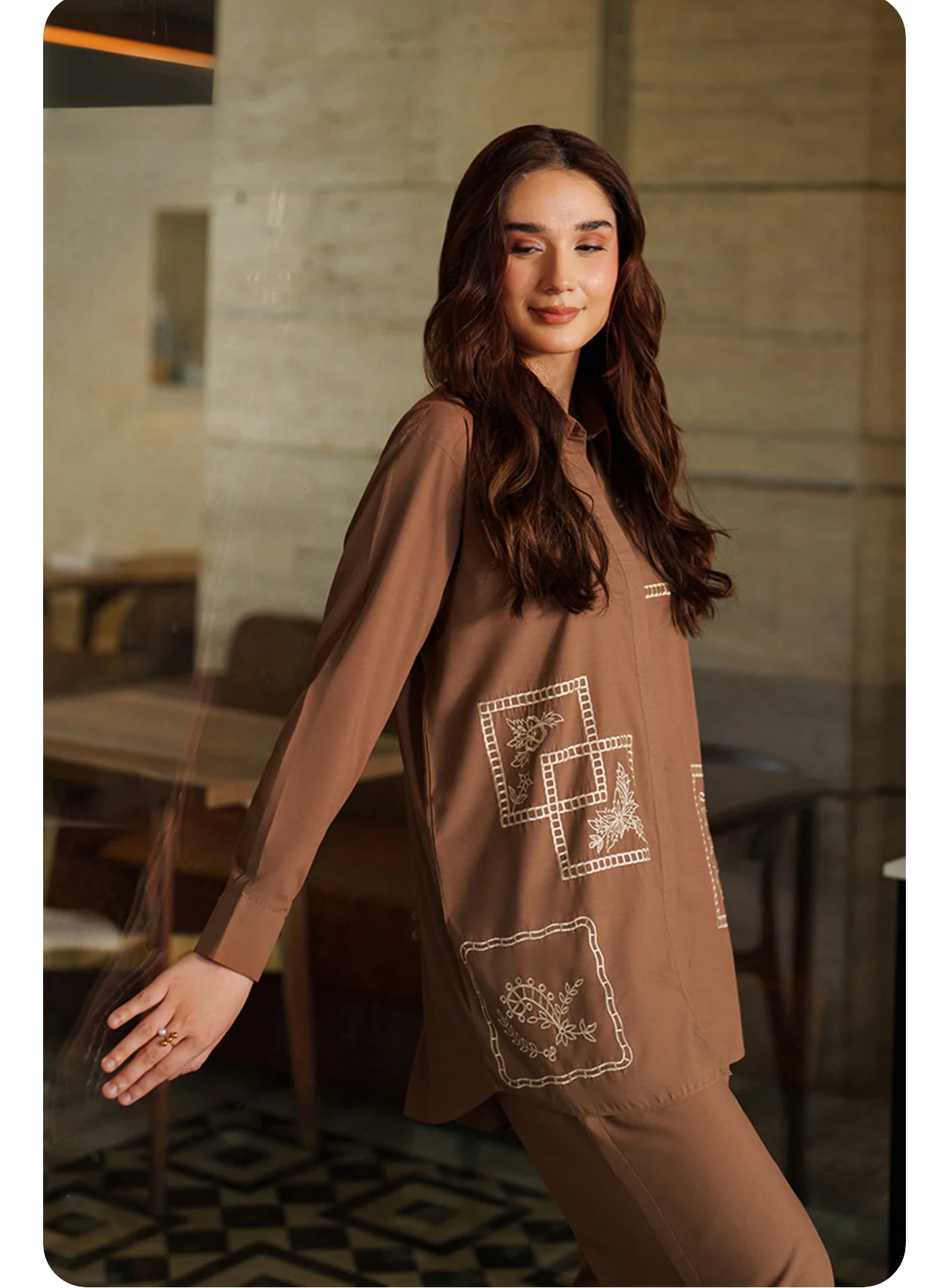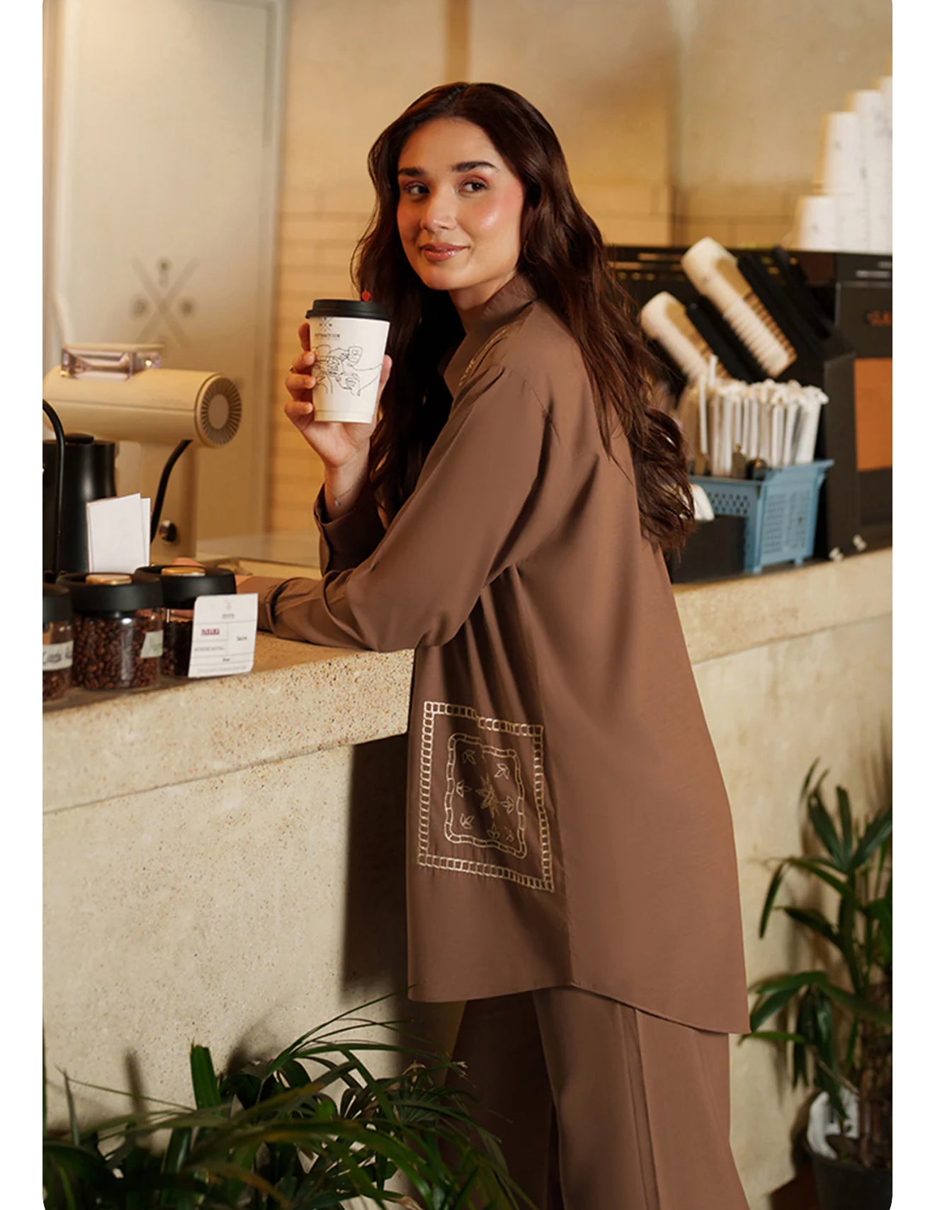 Walnut Whirl, an embroidered matching coord set in a warm brown, designed to bring earthy elegance to your everyday wardrobe.